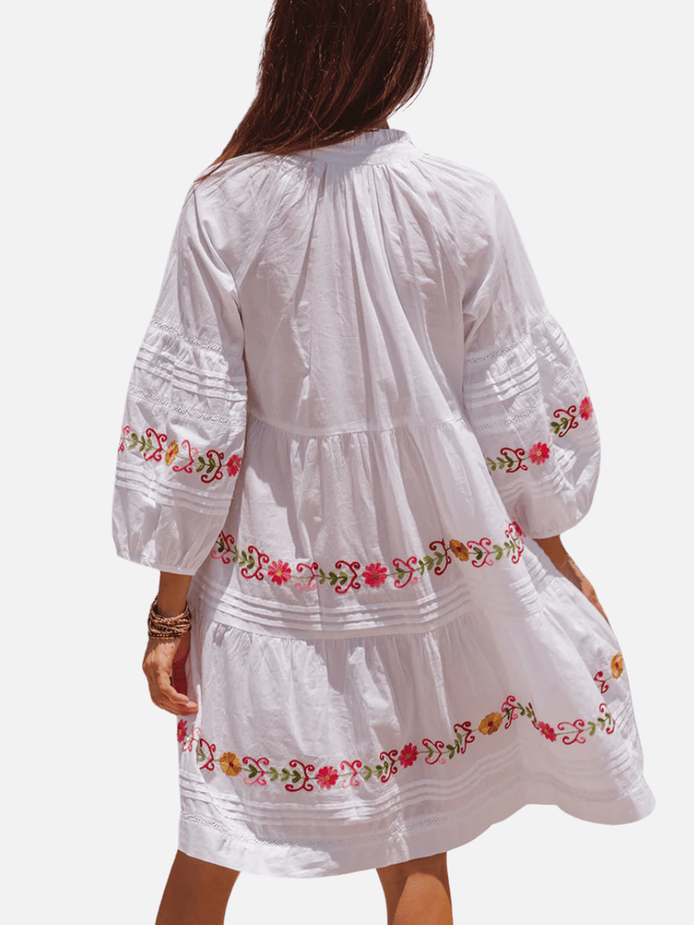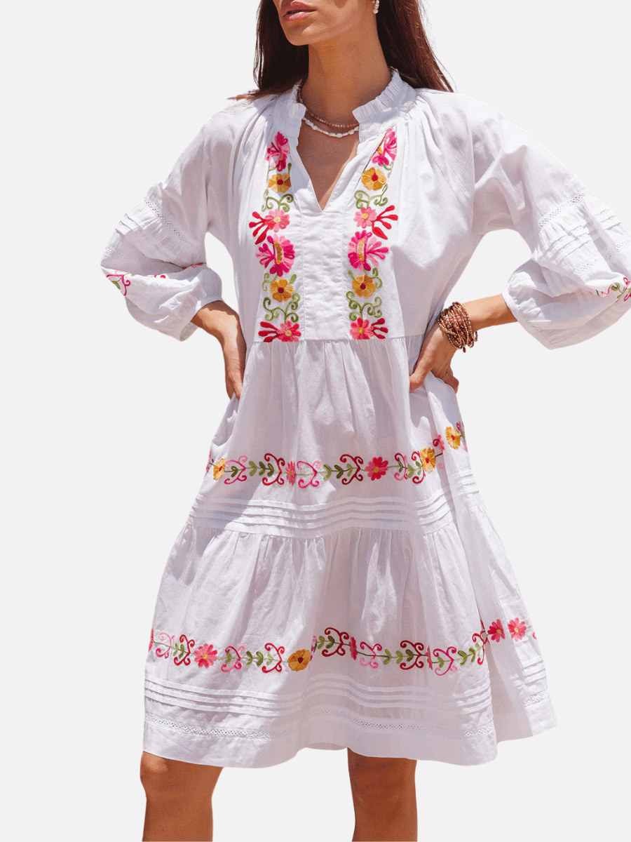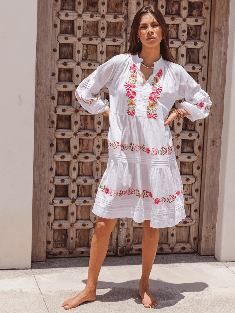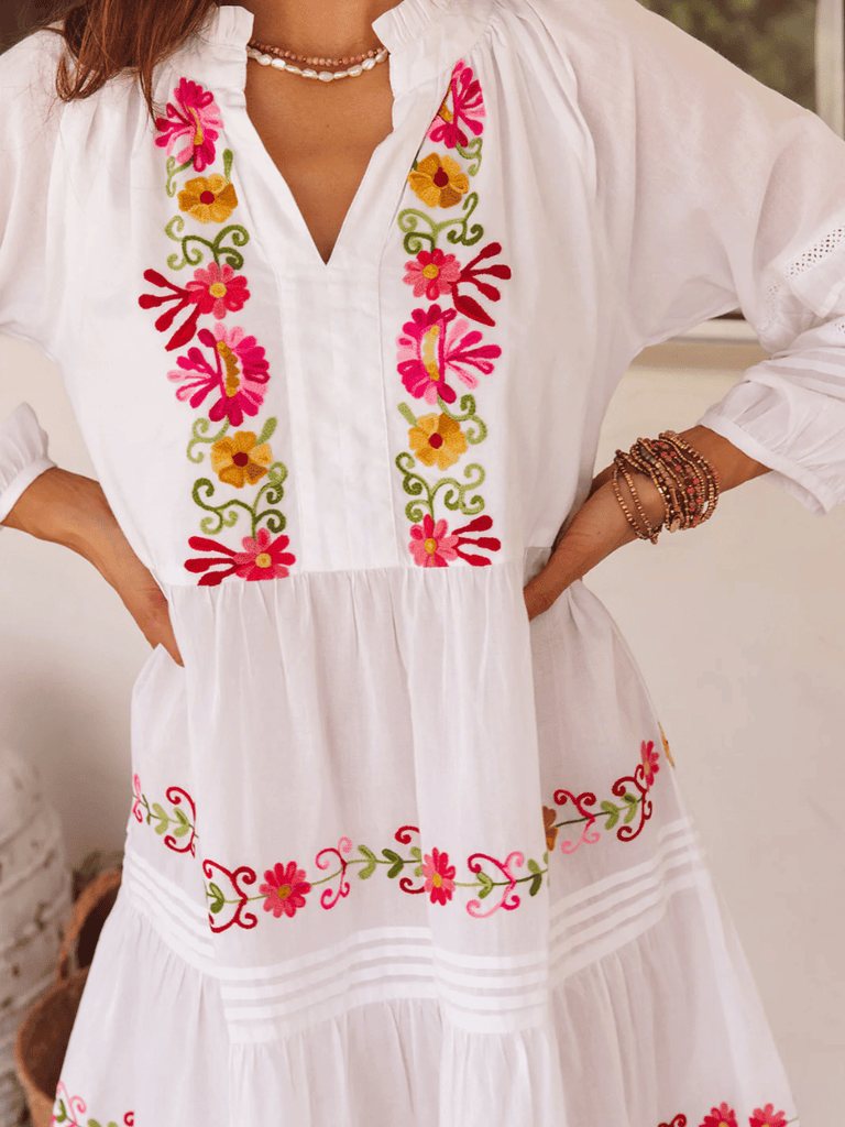 This long-sleeve relaxed fit I Am Pylgrym dress features a crisp white base with vibrant pink and multicolour floral Aari embroidery, finished with a flattering V-neckline, subtle collar detail, and tiered A-line silhouette for a light, breezy look. Voluminous sleeves with embroidered cuffs and gently gathered seams enhance movement and add artisanal charm.