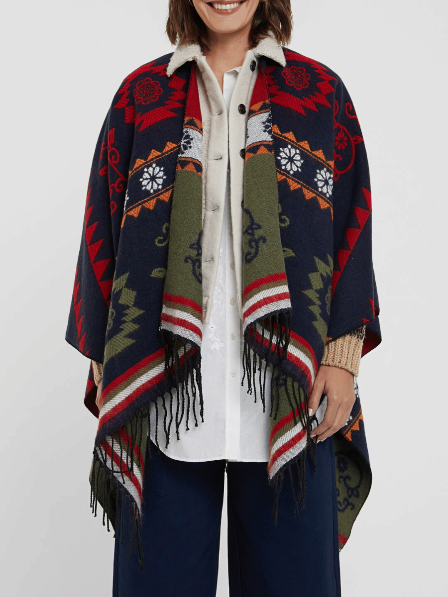 This relaxed fit Desigual poncho features a reversible design showcasing two distinct colourways. The deep navy side features red, olive, and cream ethnic motifs, and the burgundy side is accented with navy and olive patterns. The open-front design is finished with striped borders, long tasselled fringe, and a draped silhouette for a laid-back yet polished feel.