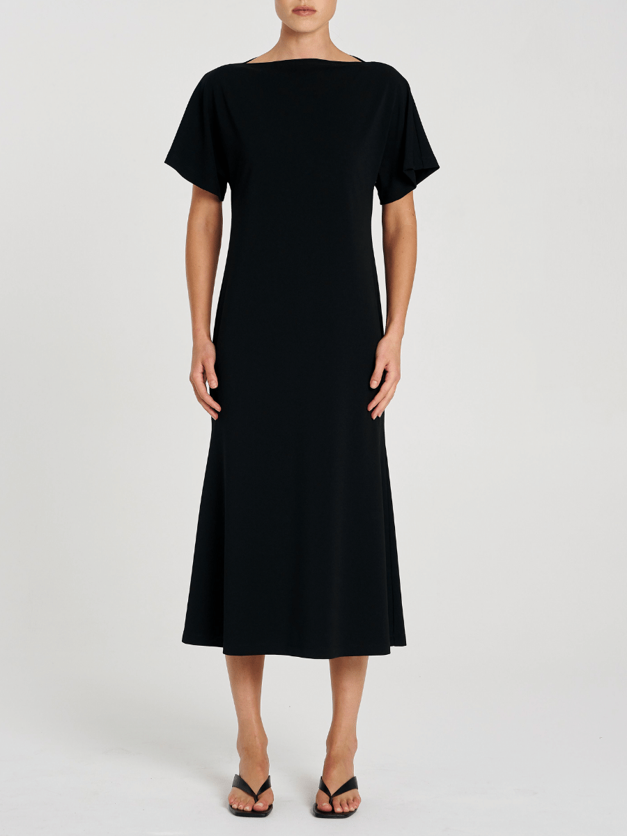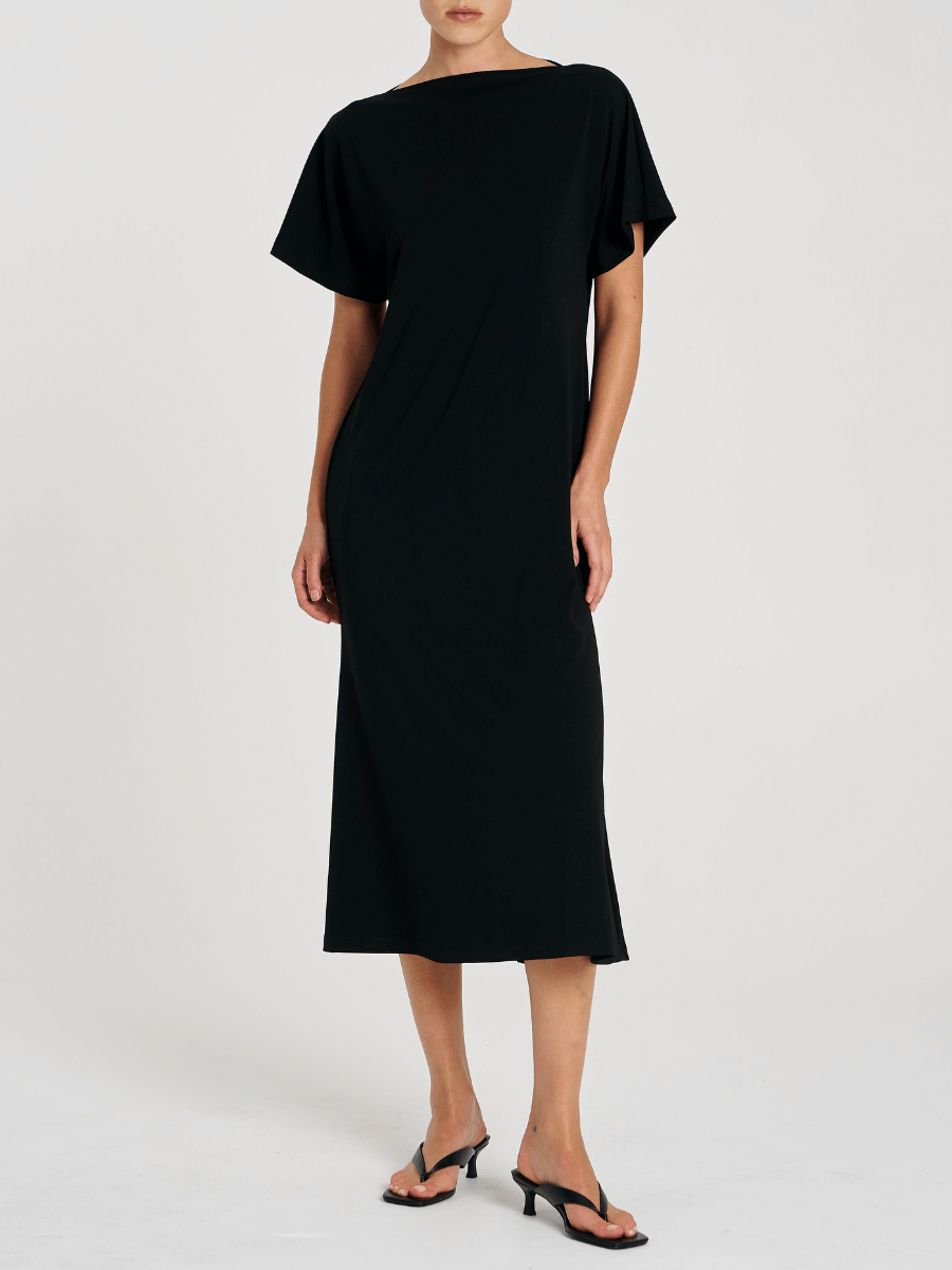 This short-sleeve relaxed fit Mela Purdie dress in black features a sliced boat neckline and a fluid fit-and-flare silhouette, designed for versatile day-to-evening wear. The Mela Purdie Slash Neck Dress is crafted from the brand’s Powder Knit fabrication, offering a luxuriously soft feel with a lightweight drape. Designed with a flattering boat neckline, relaxed short sleeves, and a mid-length hemline, this dress combines simplicity with elegance.