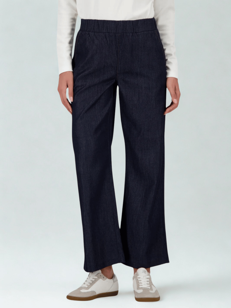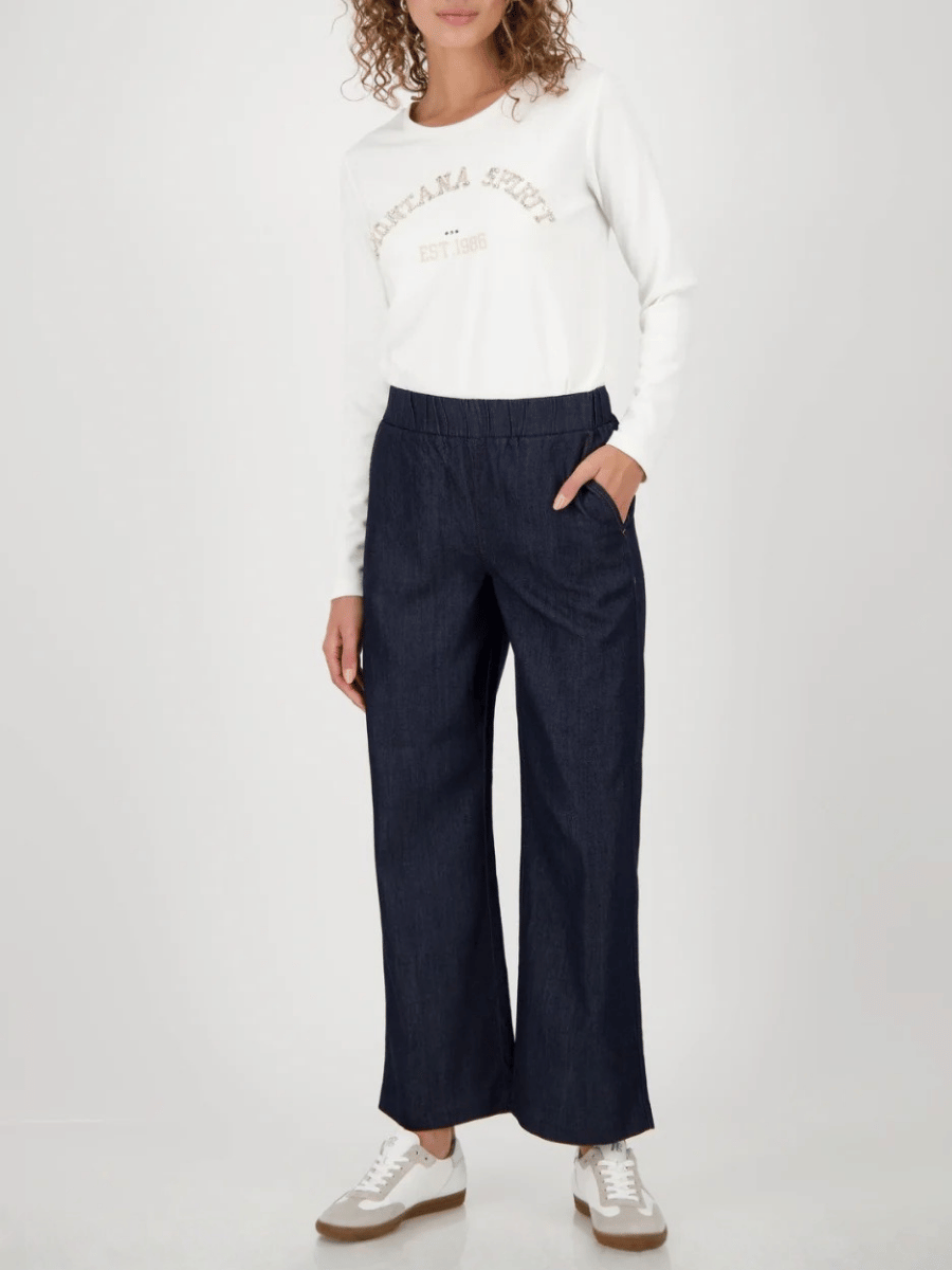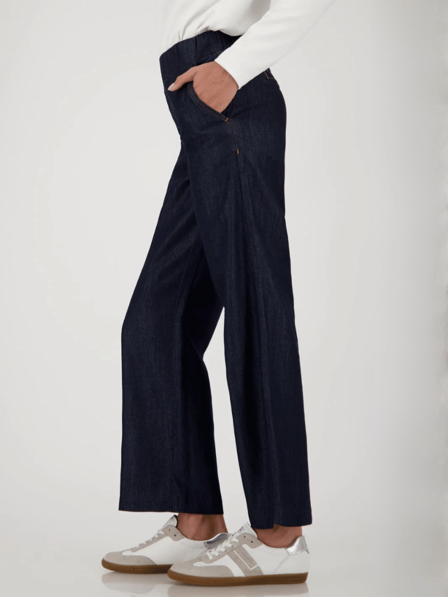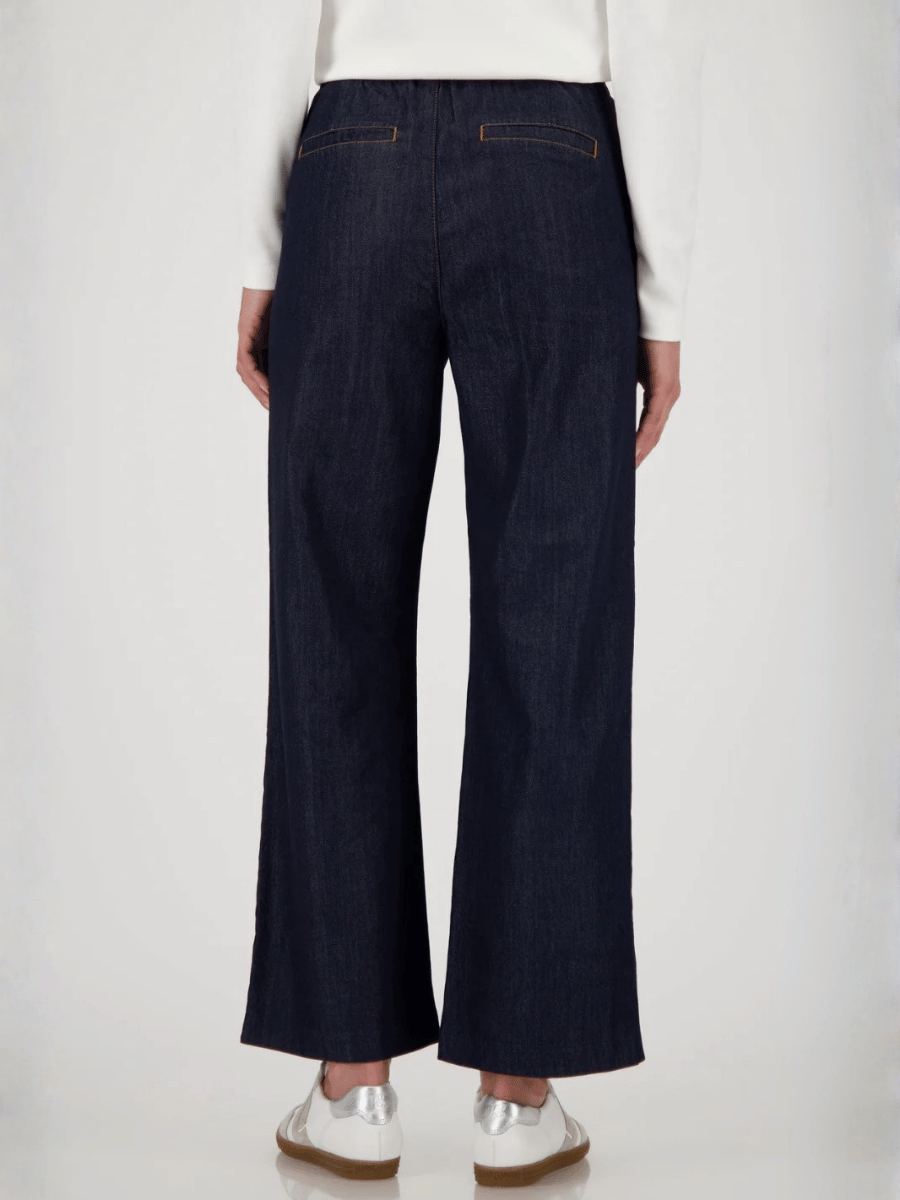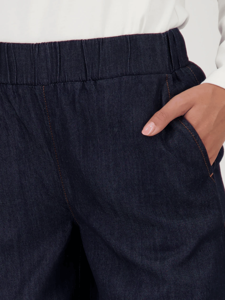 Cut with a relaxed wide-leg fit, these women’s culotte jeans offer a clean, modern silhouette designed for comfort, movement, and effortless everyday wear. The Monari Jeans Culottes in Dark Denim are crafted from a breathable lyocell–cotton blend that drapes softly while maintaining a polished denim look, giving the piece a relaxed yet refined feel.