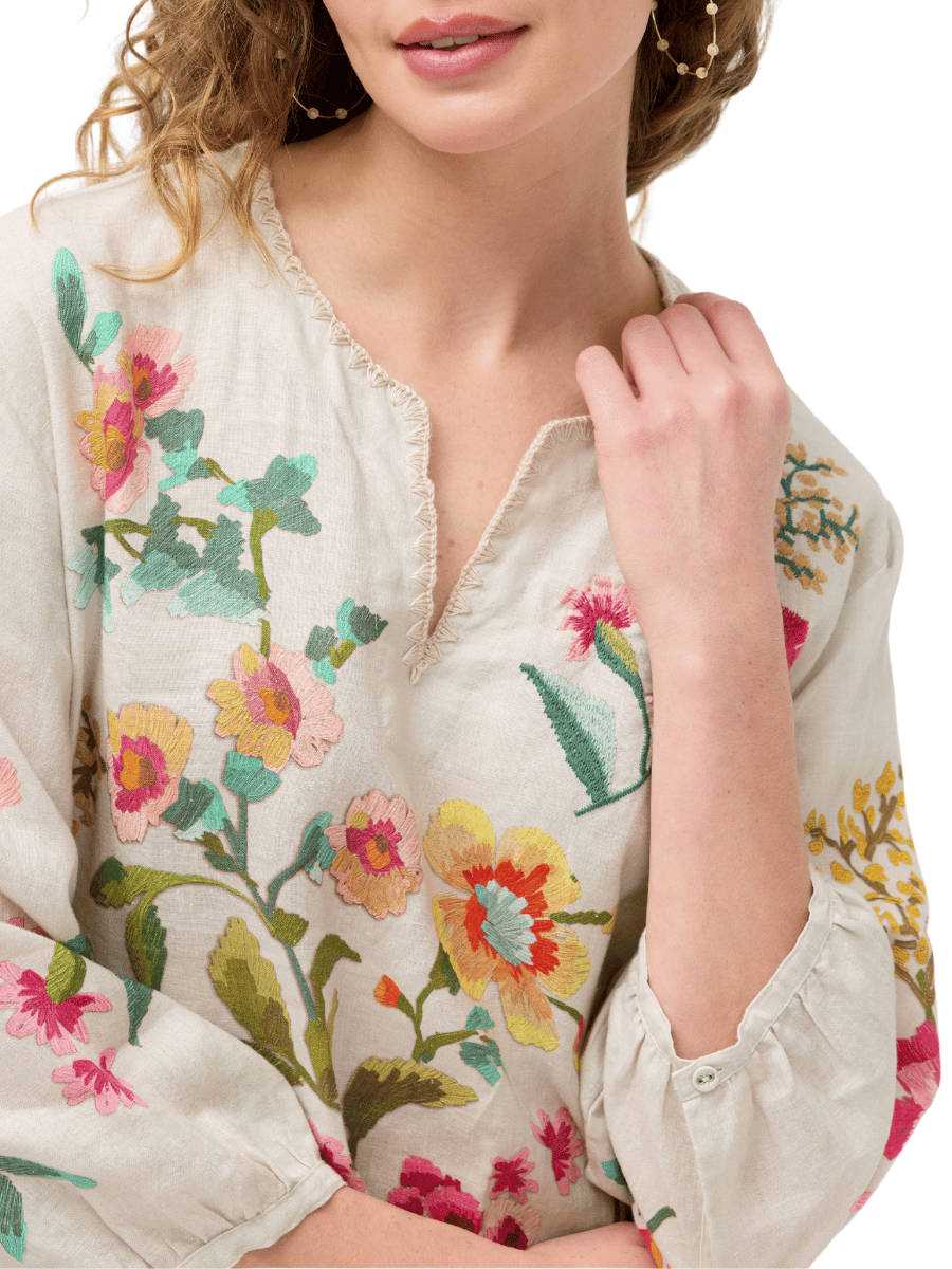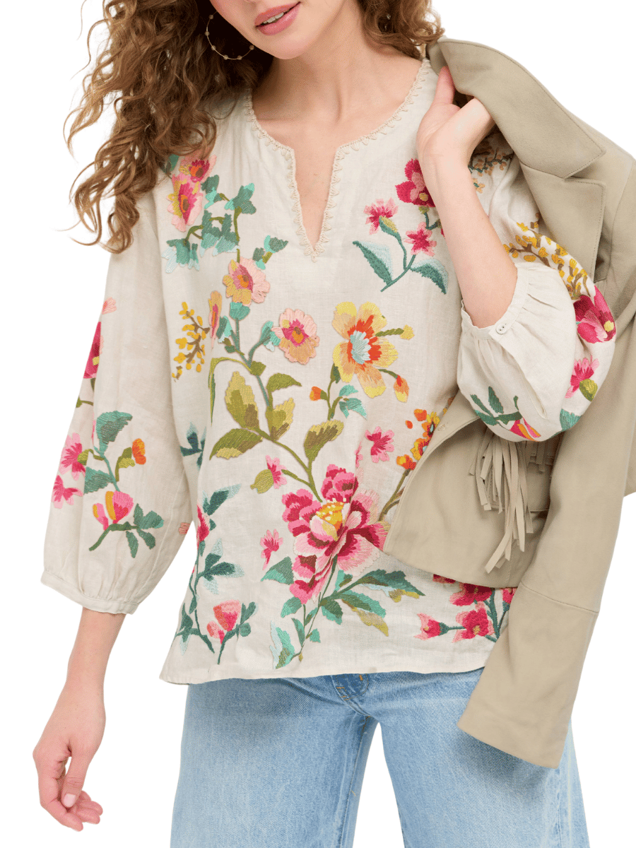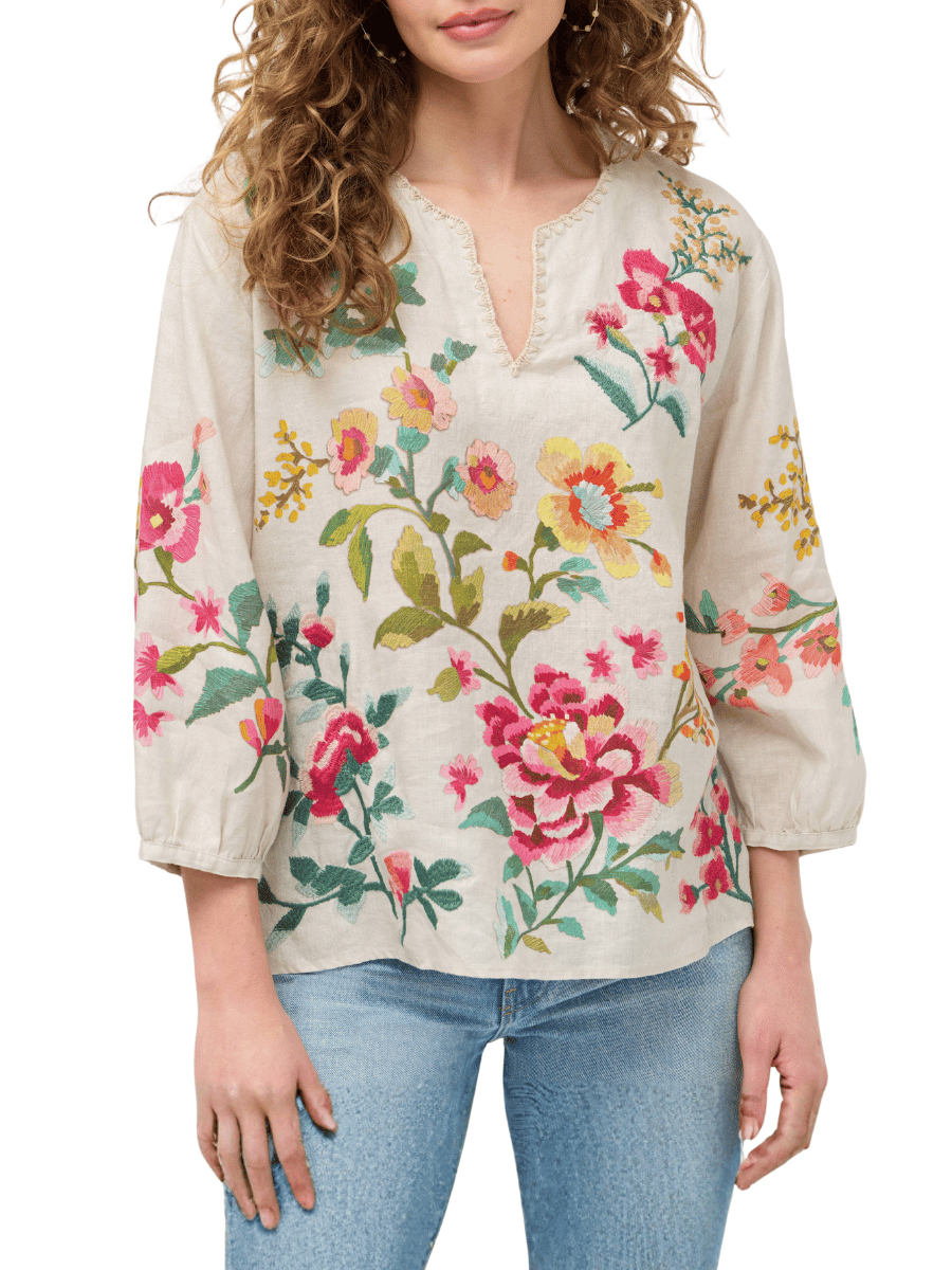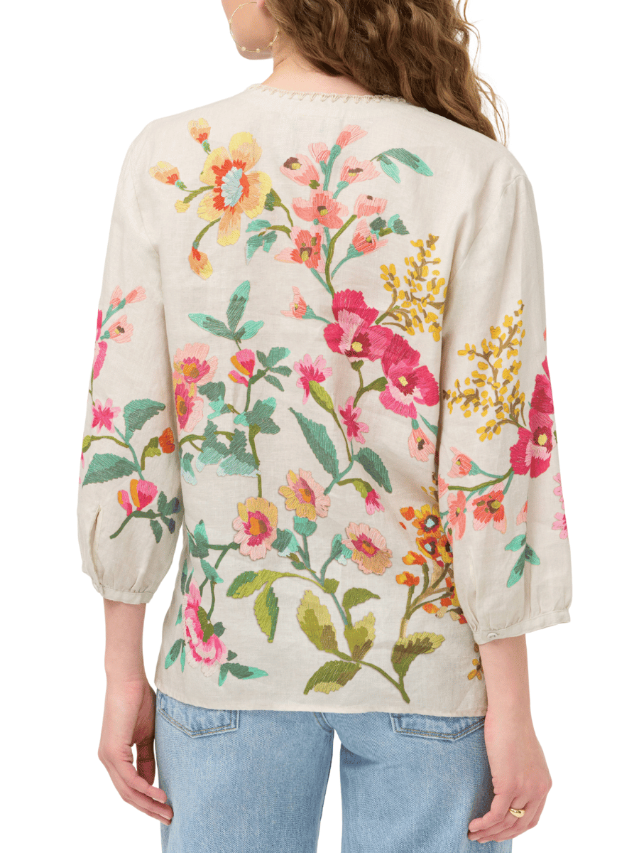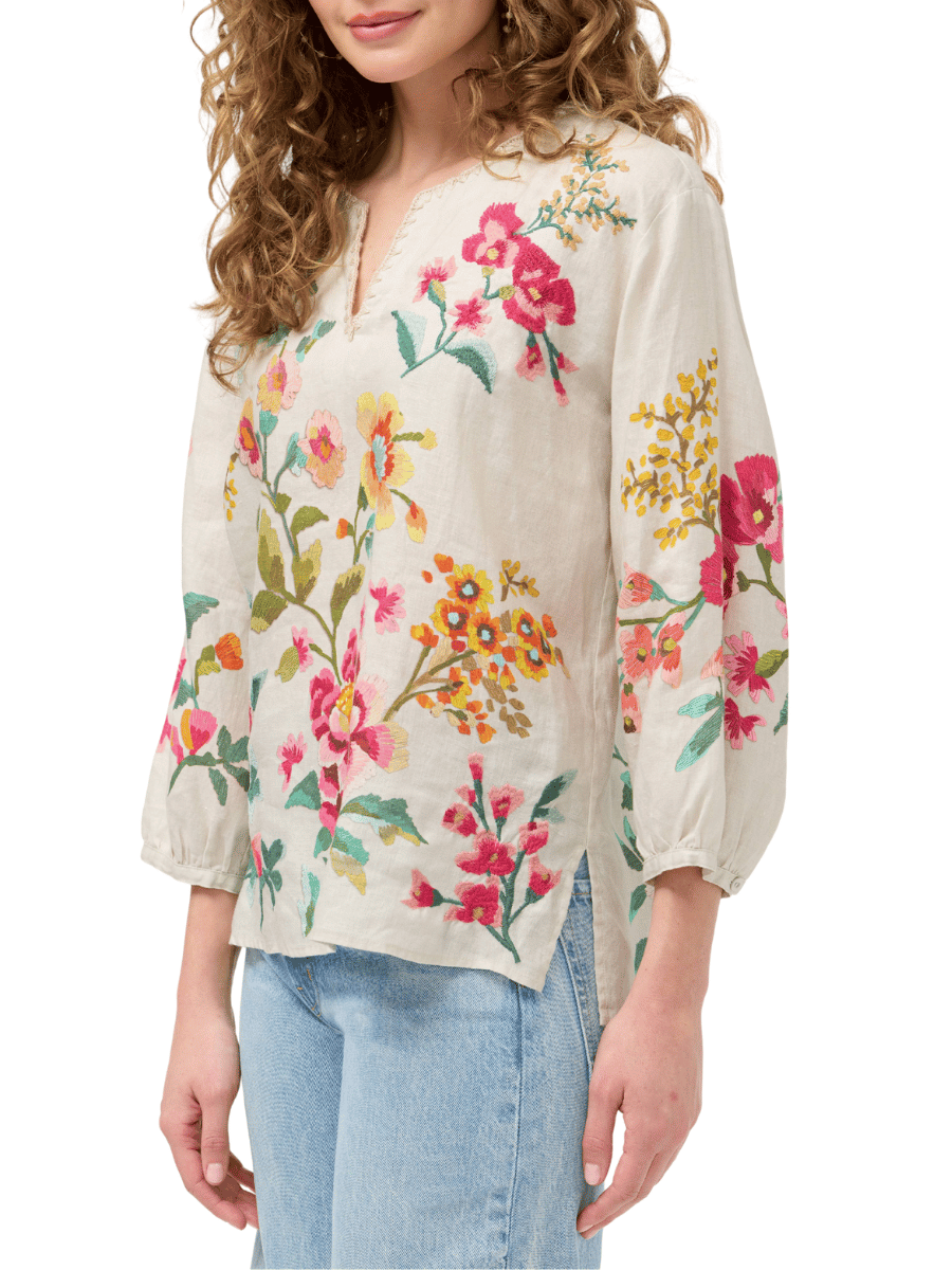 The Johnny Was Split Neck Linen Blouse in Ecru Miraze is crafted from breathable pure linen and adorned with a vibrant floral motif, enhanced by delicate embroidered detailing for added depth and texture. Designed to feel effortless yet refined, this blouse offers a fresh take on everyday dressing.