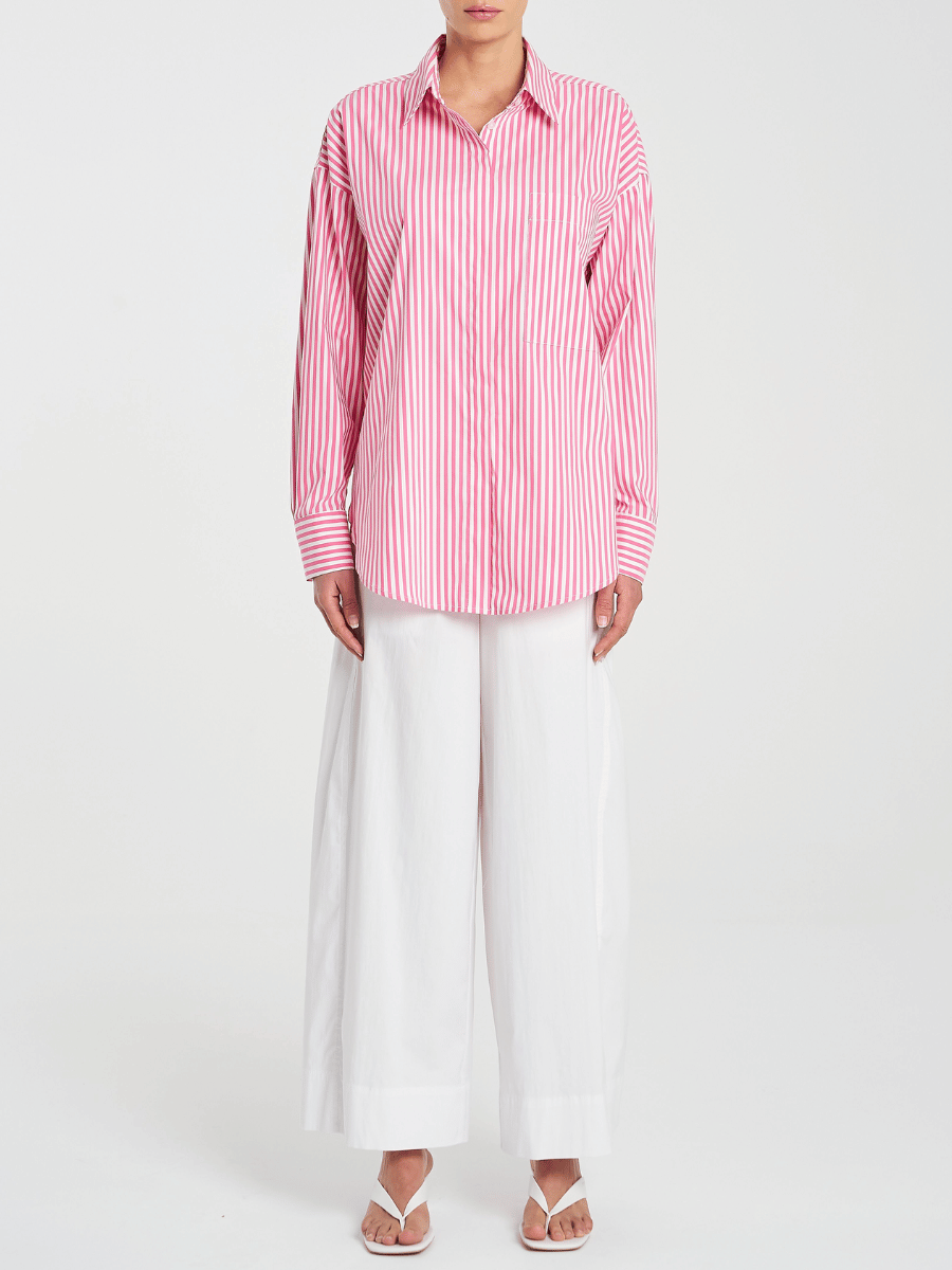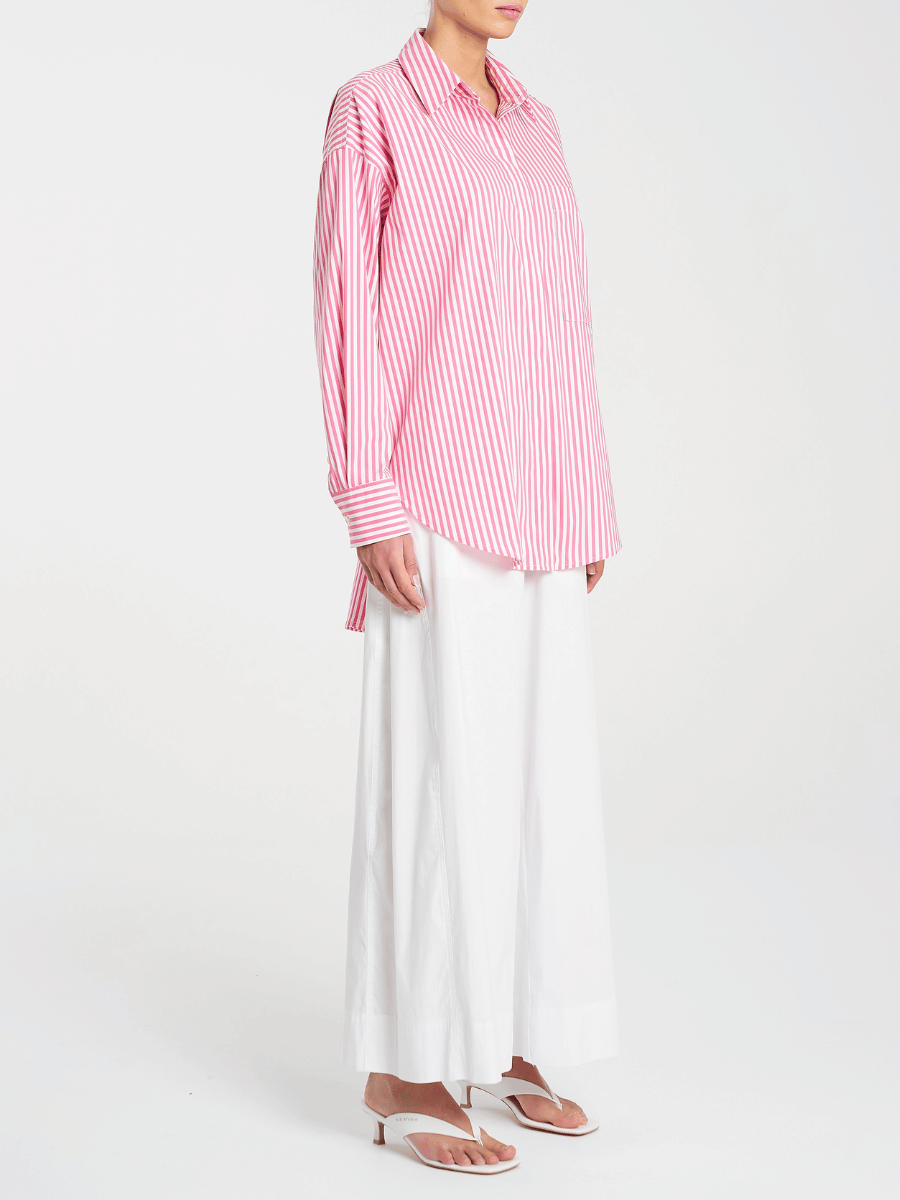 This hot pink and white striped long-sleeve Mela Purdie shirt features a crisp collar, relaxed oversized fit, and a concealed front placket for a polished everyday look.