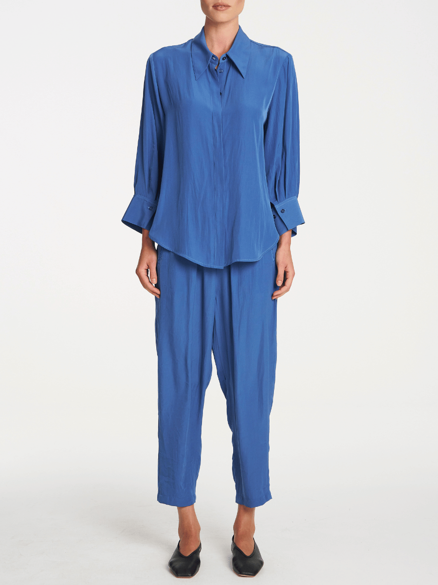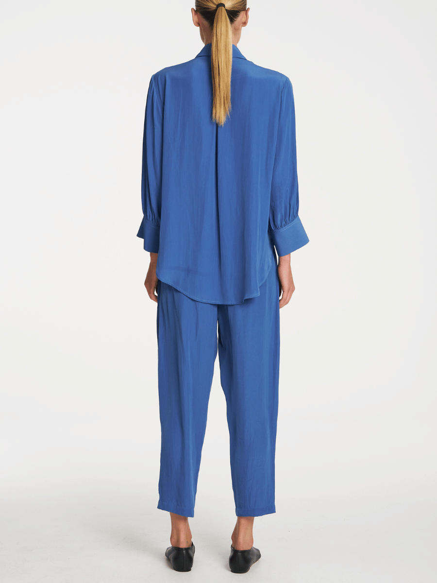 Cut with a relaxed shape, the Mela Purdie Resort Blouse falls softly through the body, with full-length sleeves finished with gathered cuffs and a centre back pleat to enhance movement and drape. The Parisian colourway, a rich mid blue, adds depth while remaining versatile for both elevated and everyday styling.