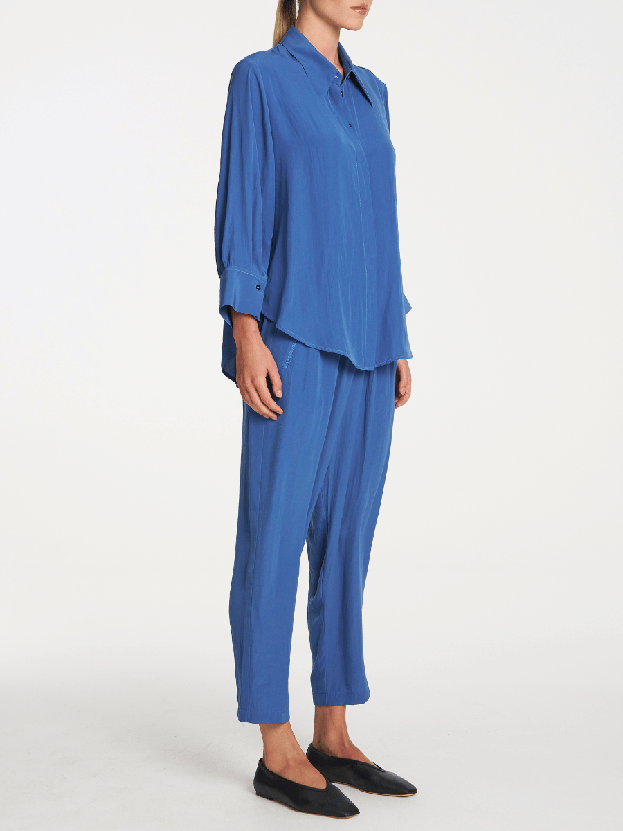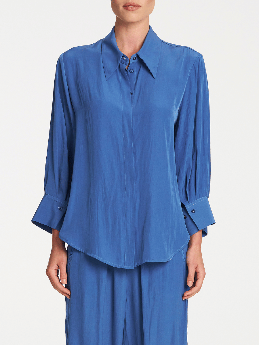 The Mela Purdie Resort Blouse in Parisian is a long sleeve relaxed-fit blouse crafted from Mache, a fine denier Japanese technical weave with an air-flow finish and soft lustre surface. This women’s blue blouse features a crisp collar, concealed front placket, and a fluid silhouette designed for effortless wear.