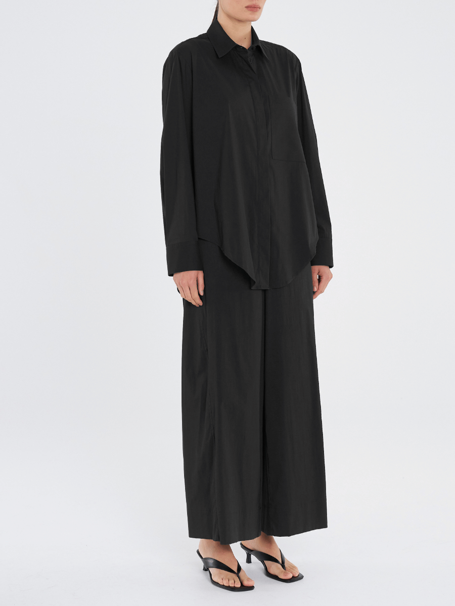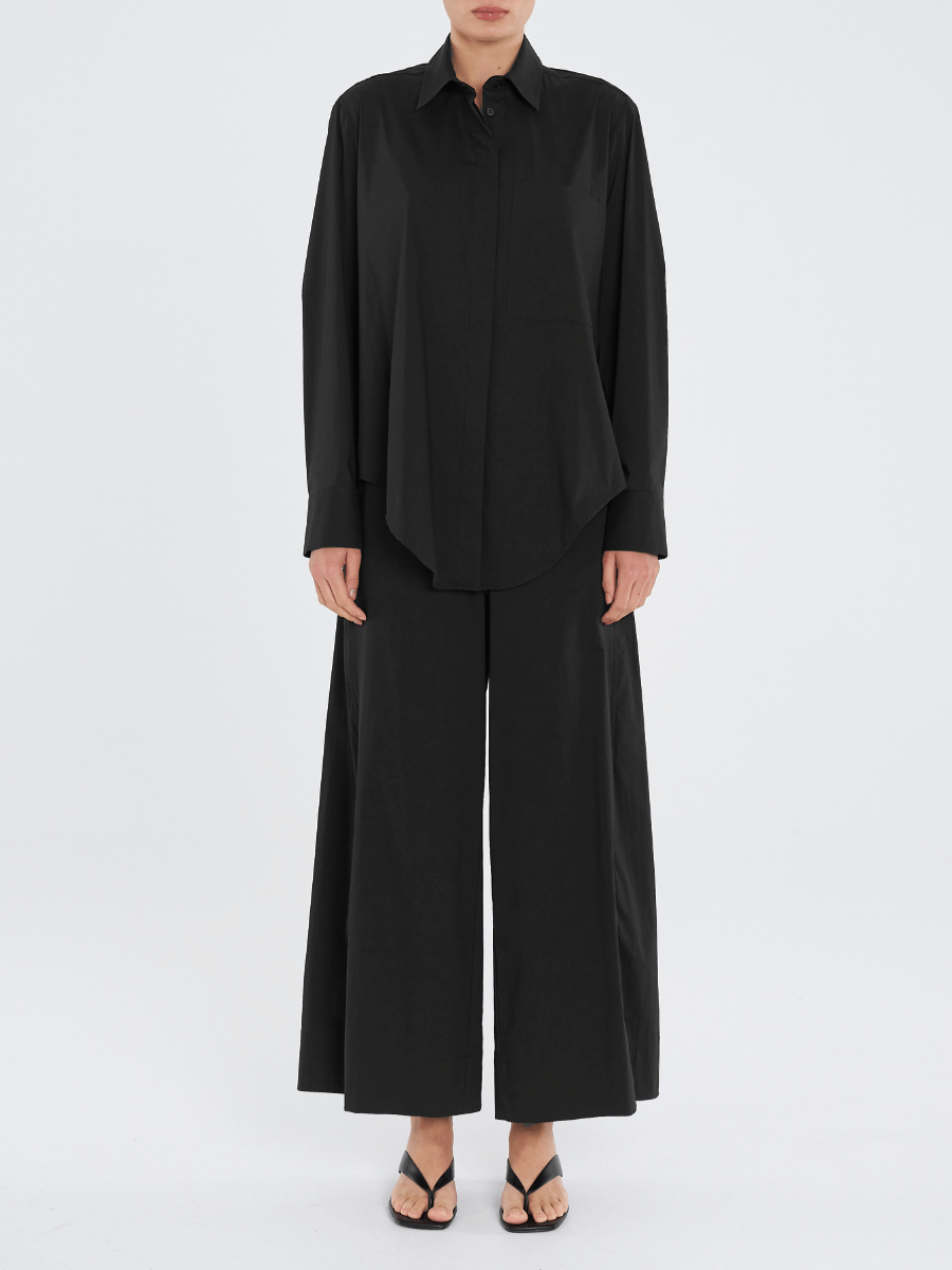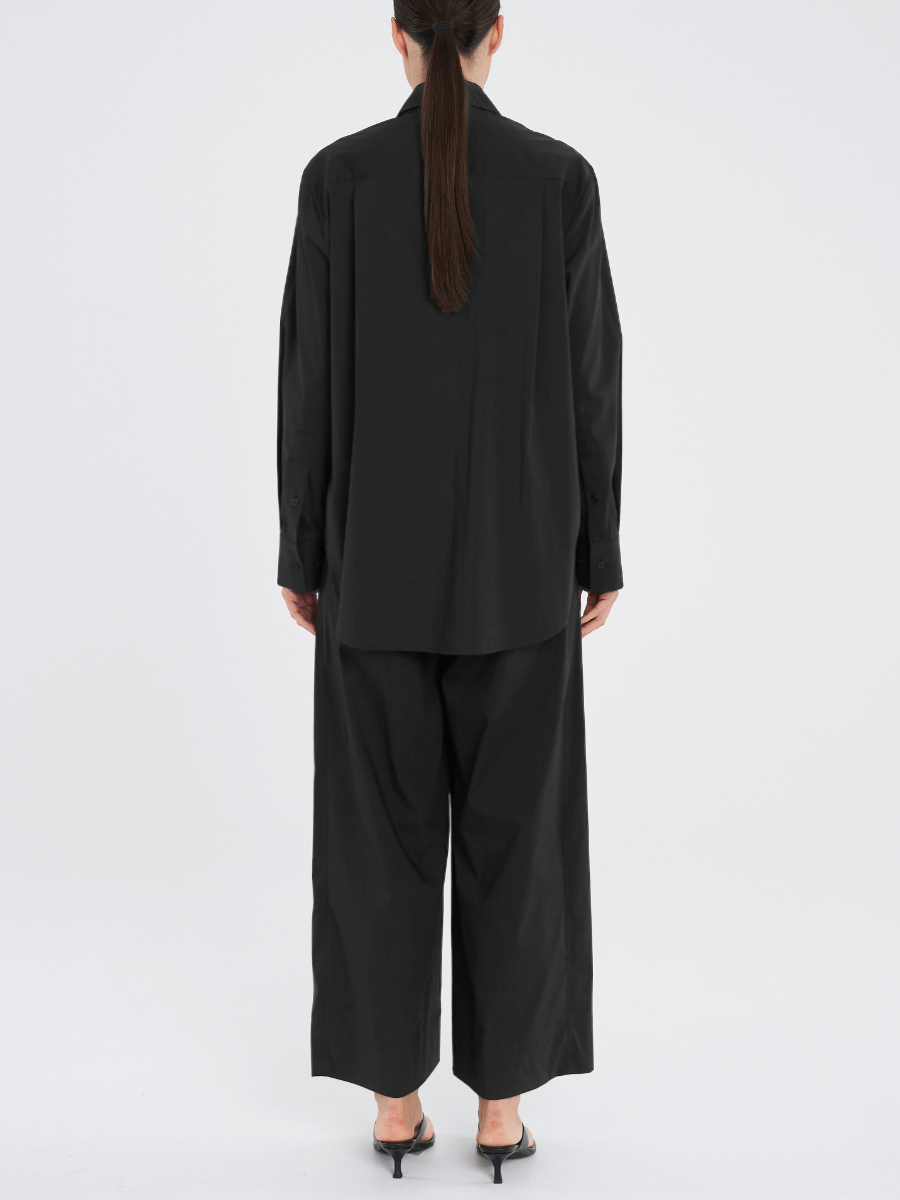 This long-sleeve oversized fit Mela Purdie shirt in classic black features a crisp collar, concealed front placket, and a curved longline hem for a streamlined, contemporary silhouette.