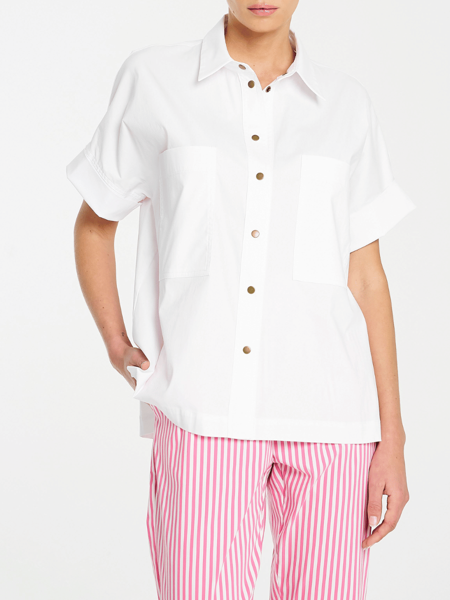 Tailored from Mela Purdie’s signature Microprene stretch cotton blend, the Stud Shell Shirt delivers breathable comfort and easy movement. Style it with the Mela Purdie Nomad Pant Hot Pink and White Stripe or pair it with tailored trousers for a clean, spring-summer look.