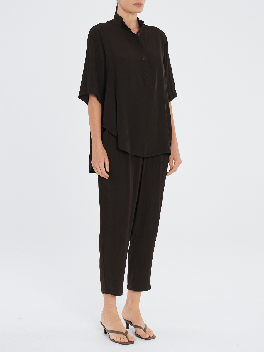 This mid-sleeve relaxed fit Mela Purdie top in Fudge is defined by a soft funnel neckline, partial button-through placket and a dramatic curved hem, creating a fluid longline silhouette with modern structure.