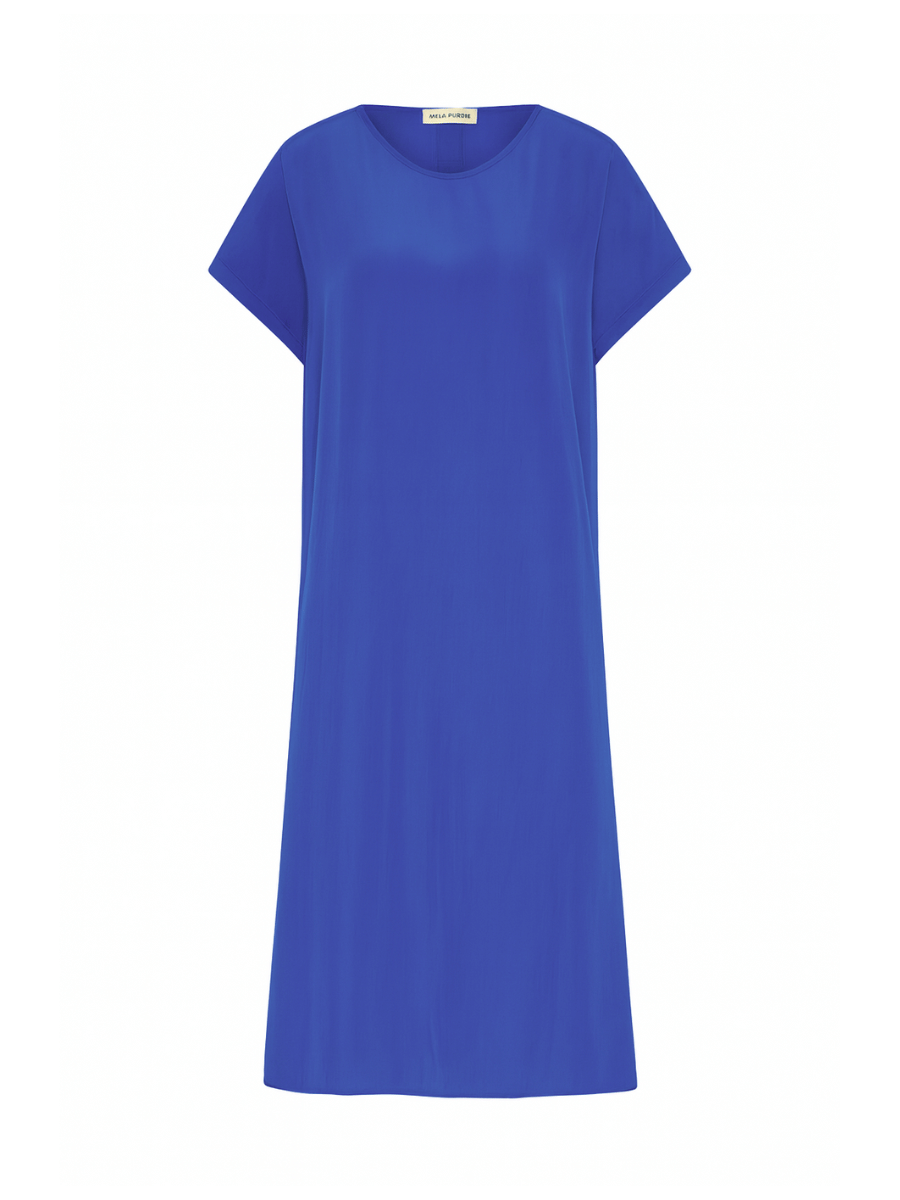 This short-sleeve relaxed-fit Mela Purdie dress features a vivid cobalt blue tone and a clean scoop neckline, cut in a streamlined T-shirt silhouette that falls softly through the body. Designed for an easy, fluid drape, it offers a simple yet refined shape ideal for everyday versatility.