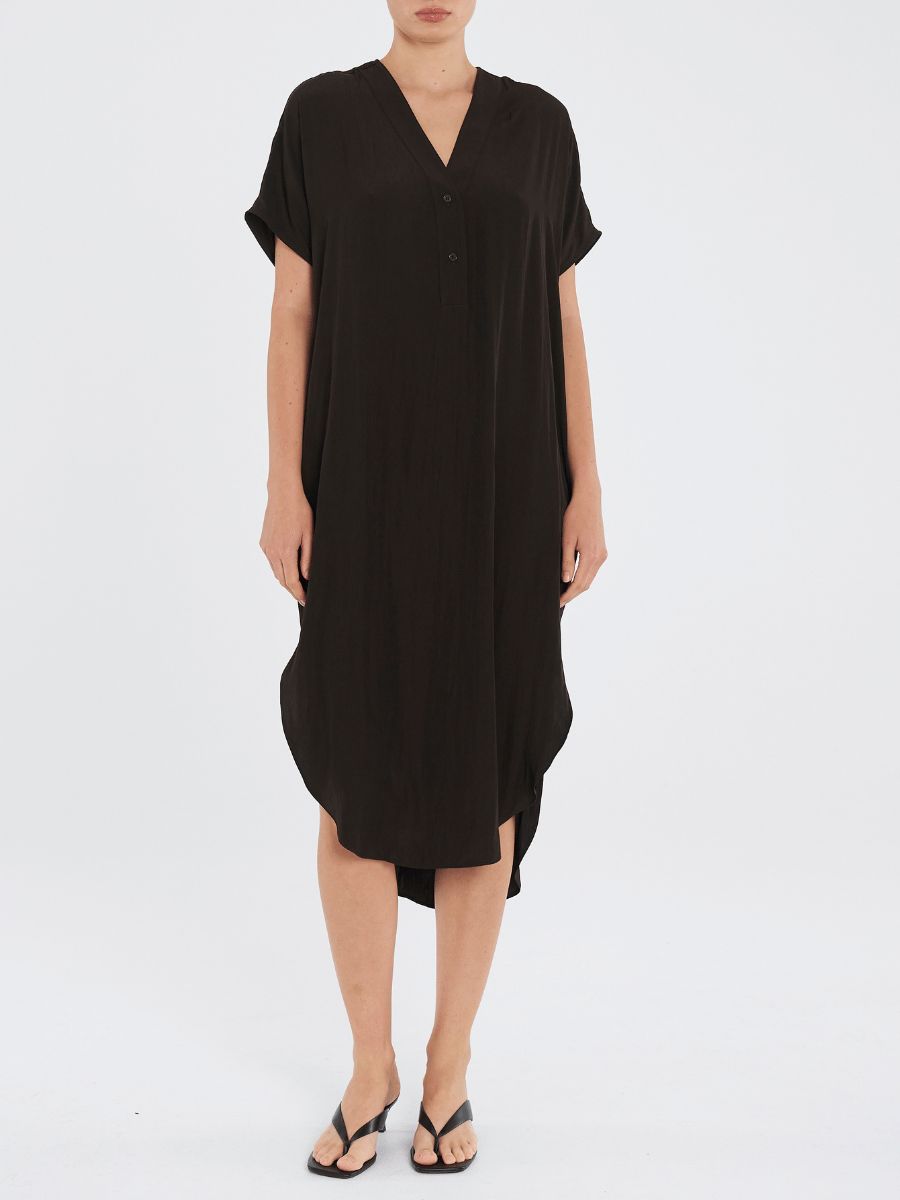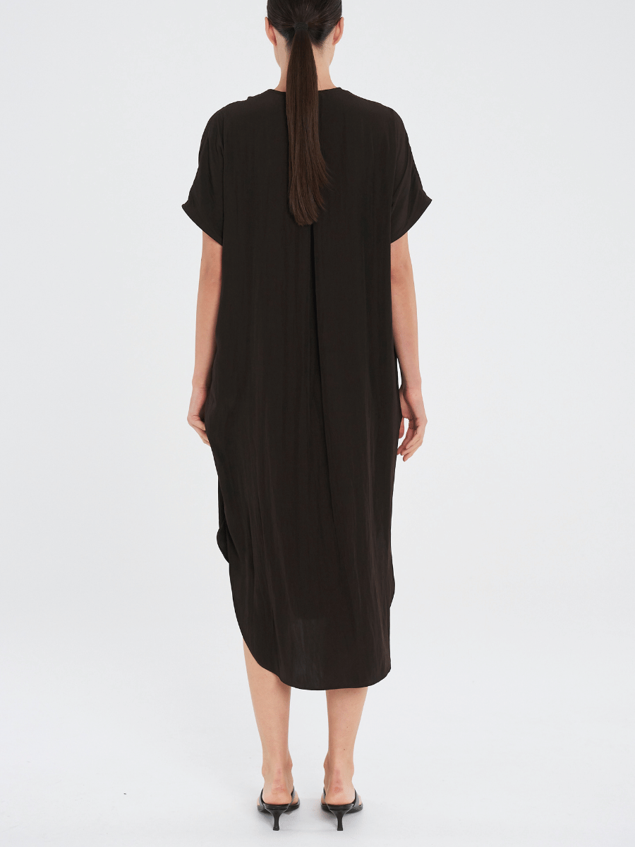 This short-sleeve relaxed fit Mela Purdie dress in Fudge is shaped by a clean V-neckline with button detailing, soft cap sleeves and a dramatic curved hem that creates a fluid, sculptural mid-length silhouette.