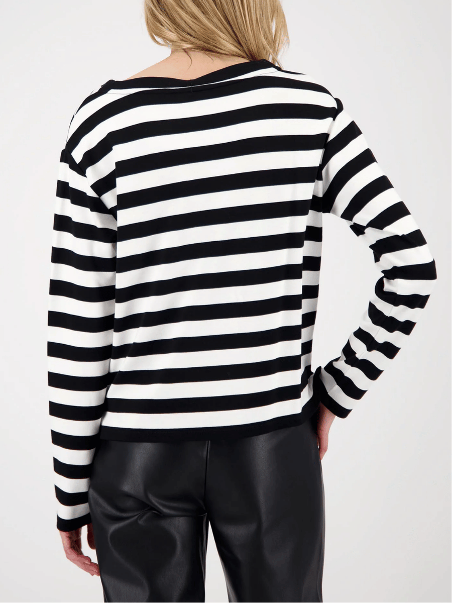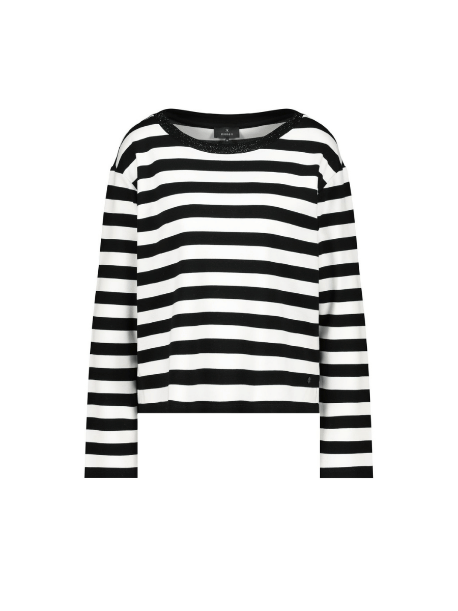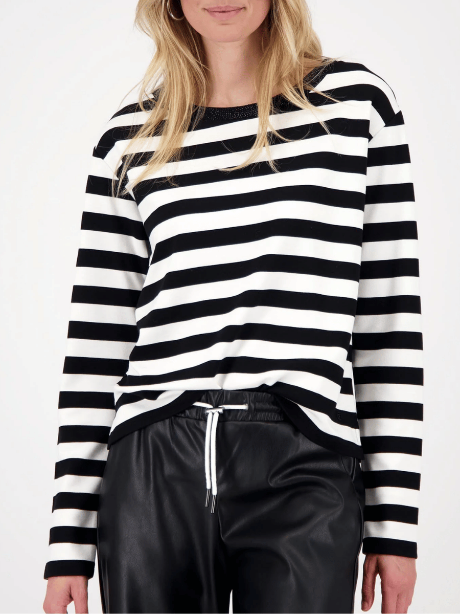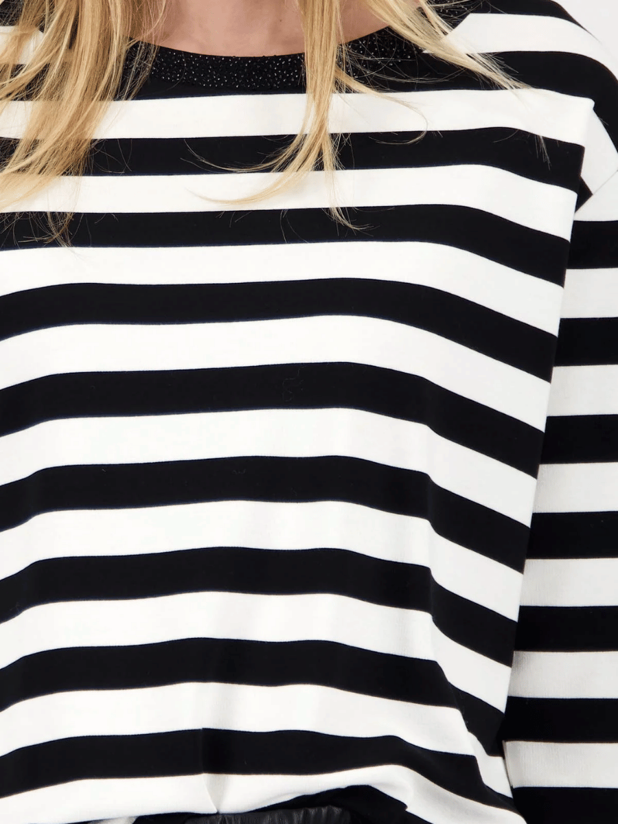 Cut with a relaxed fit, this women’s long-sleeve top offers a softly draped silhouette designed for comfort, movement, and effortless everyday styling. The Monari Crystal Neck Stripe Top in Black and White is crafted from a lightweight stretch viscose blend, while the classic horizontal stripe pattern is elevated by a shimmering rhinestone-embellished neckline for a refined yet modern finish.