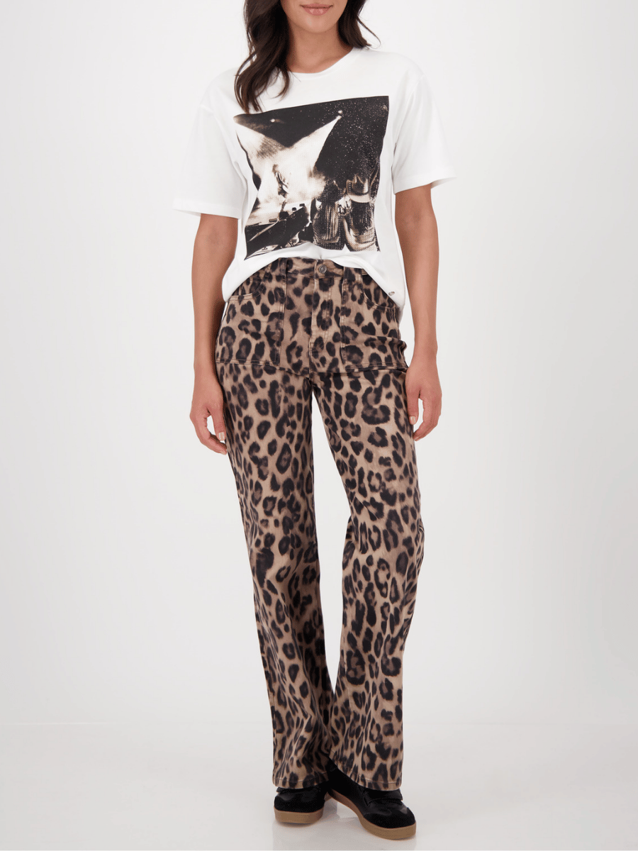 Wear the Monari Embellished Rockstar Graphic T-Shirt in Off White with the Monari Embellished Straight-Leg Jeans in Black or layer it under the Monari Leopard Print Cropped Jacket in Cinnamon for effortless off-duty styling. This Monari embellished tee pairs easily with denim, tailored trousers, or leather-look pants, making it a versatile designer graphic t-shirt for year-round wear.