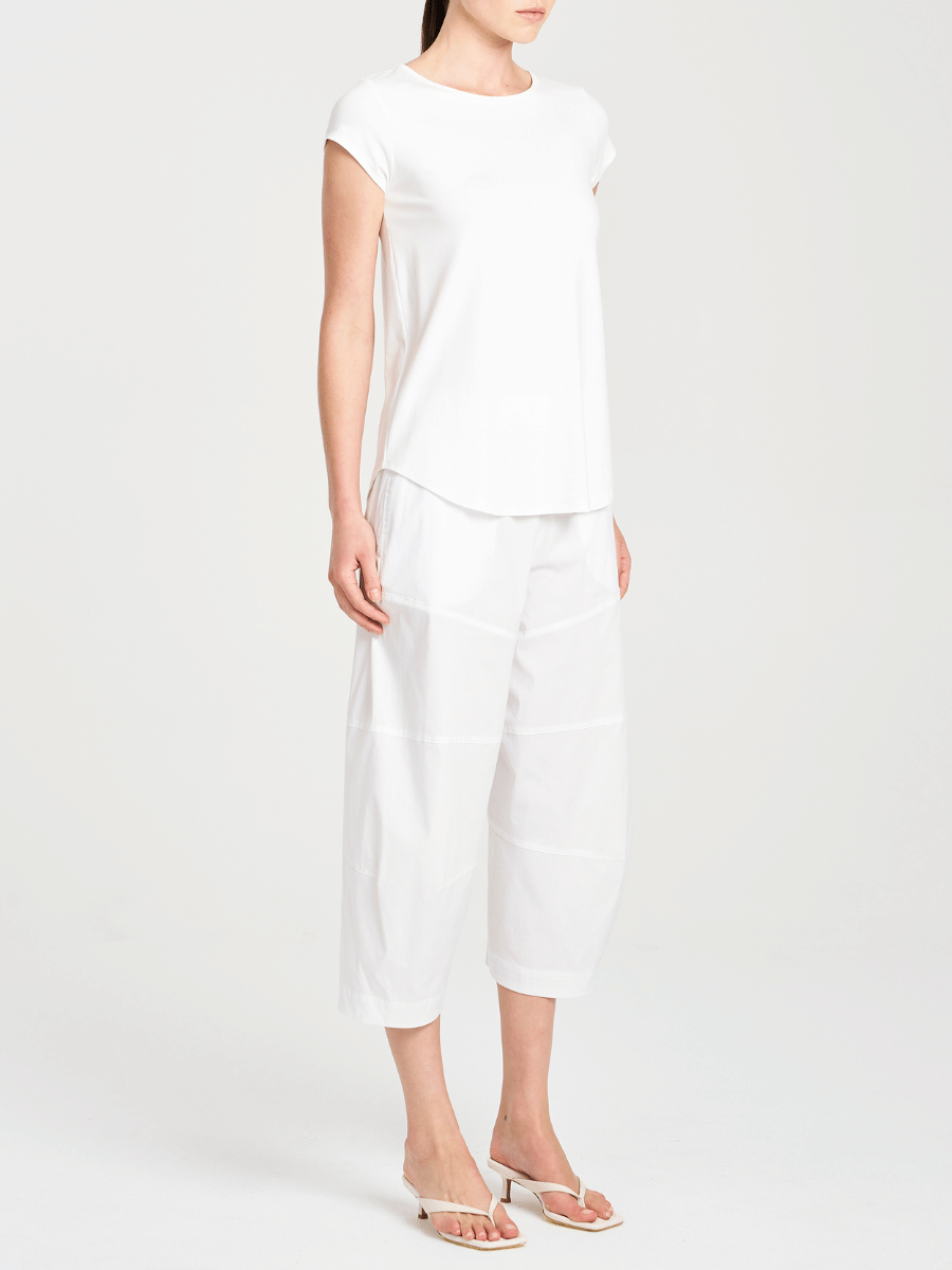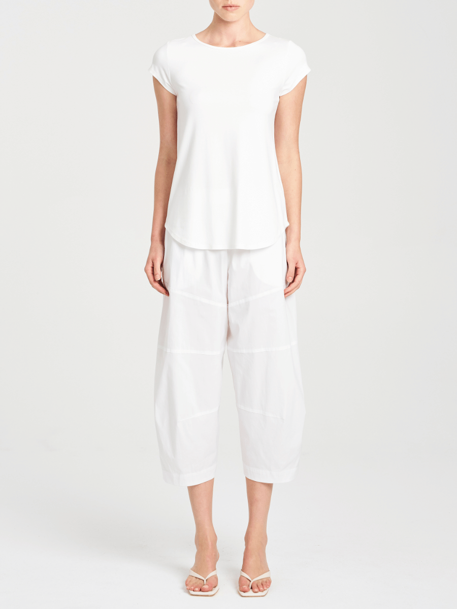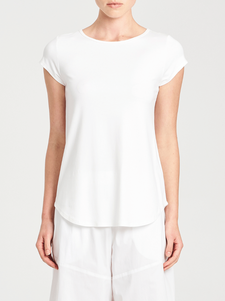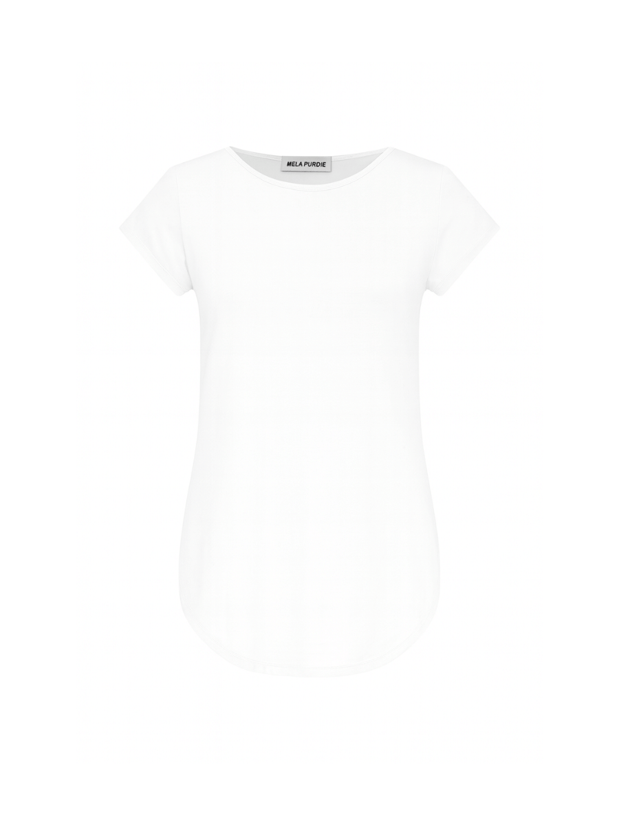 This cap-sleeve, relaxed fit Mela Purdie tee features a soft scoop neckline and gently curved hem, designed to create a clean, modern silhouette that flatters every shape. The Mela Purdie Cap Sleeve Café T is crafted with a fluid drape and subtle stretch for everyday comfort. Designed with minimal seaming, a rounded neckline, and neatly finished cap sleeves, it offers an effortless balance of structure and ease.