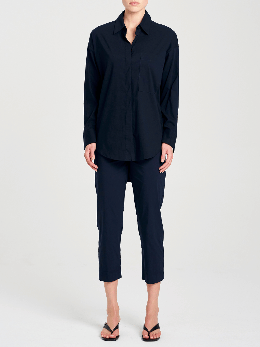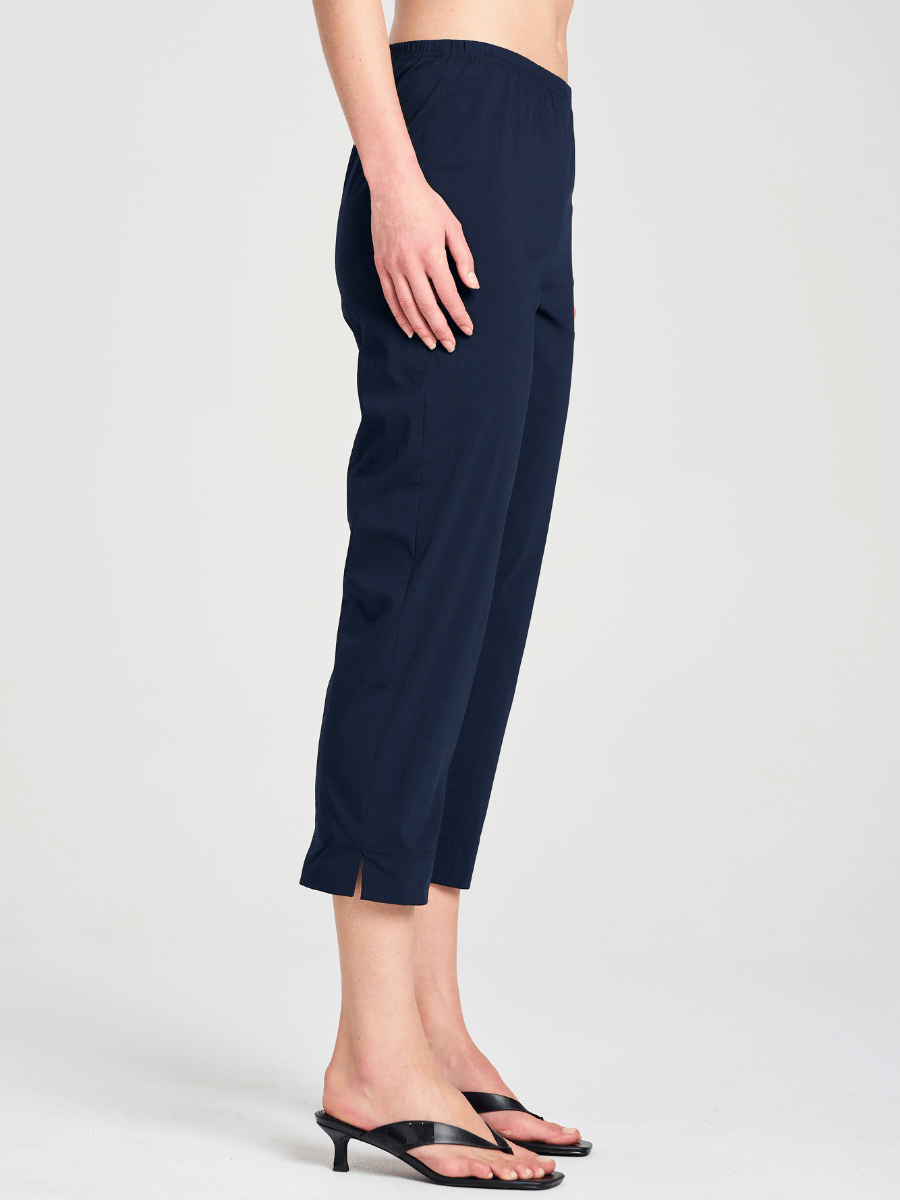 This mid-rise, relaxed fit Mela Purdie pant features a rich French Navy hue and a cropped straight-leg silhouette, designed with an elasticised waistband and clean hemline for effortless everyday wear. The Cropped Pant by Mela Purdie is a versatile wardrobe essential offering a refined yet relaxed fit. Subtle tailoring through the leg ensures a smooth, streamlined shape.
