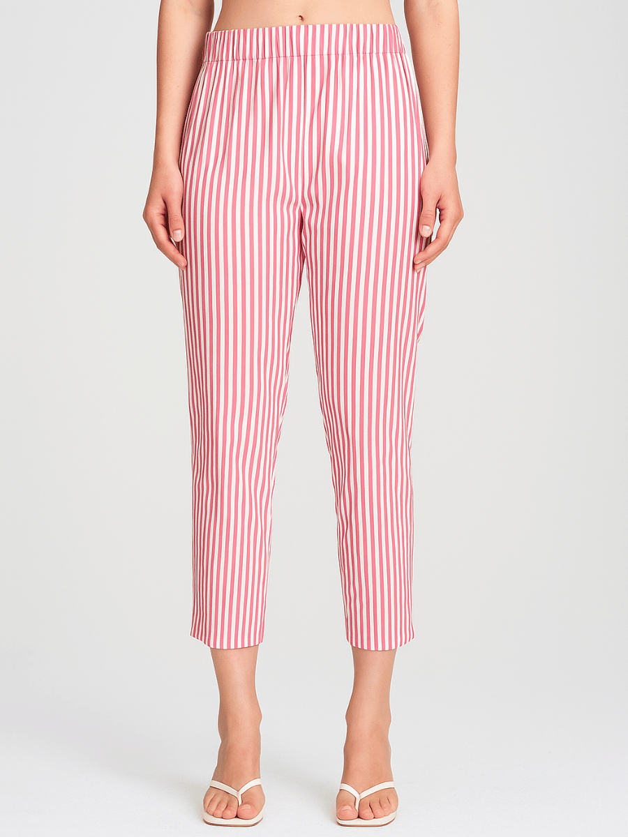 This cropped tapered fit Mela Purdie pant features hot pink and white stripes, a standard-rise waist, and a tailored silhouette with side pockets. Cut in a slightly cropped length and featuring an elasticated waistband, the Nomad Pant offers a comfortable fit and versatile styling for the spring and summer season.