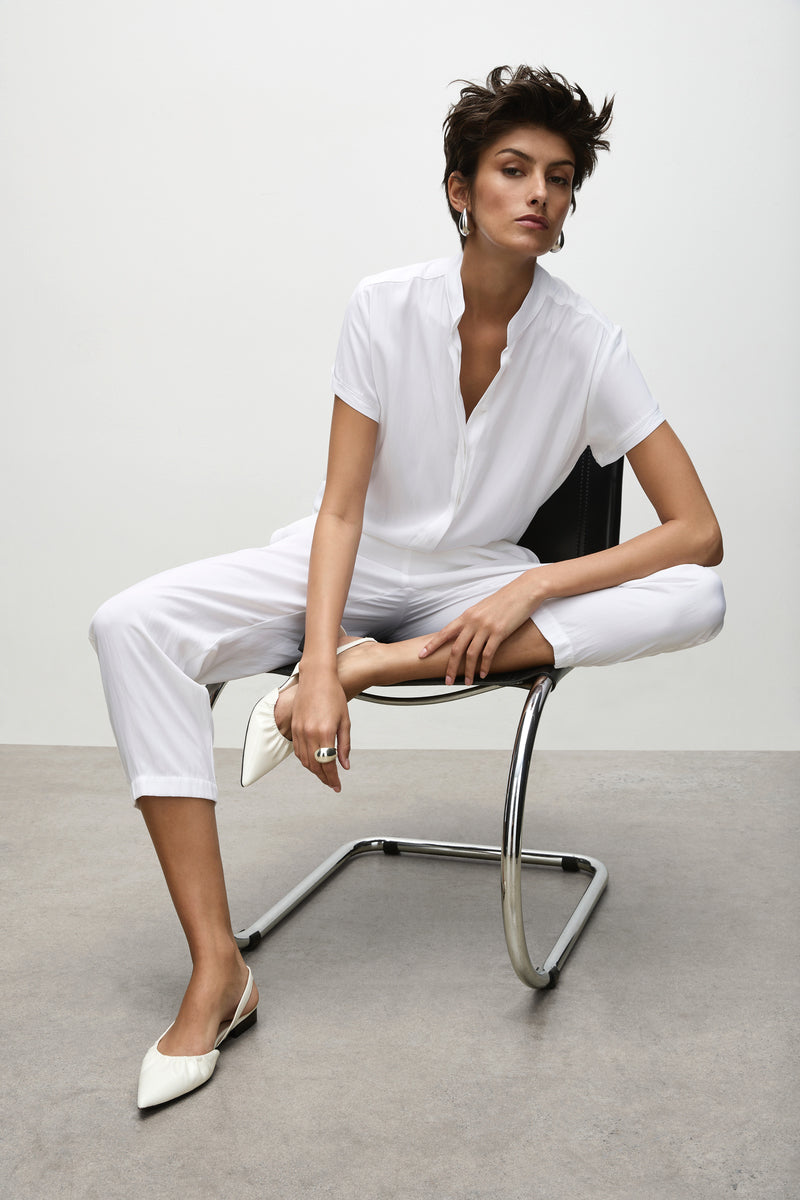 Perfect for versatile styling, the Mela Purdie Soft Stand Shirt transitions effortlessly from day to evening. Team with the coordinating Mela Purdie Pace Pant in White for chic vacation dressing. The timeless cut makes it a staple wardrobe piece across seasons.
