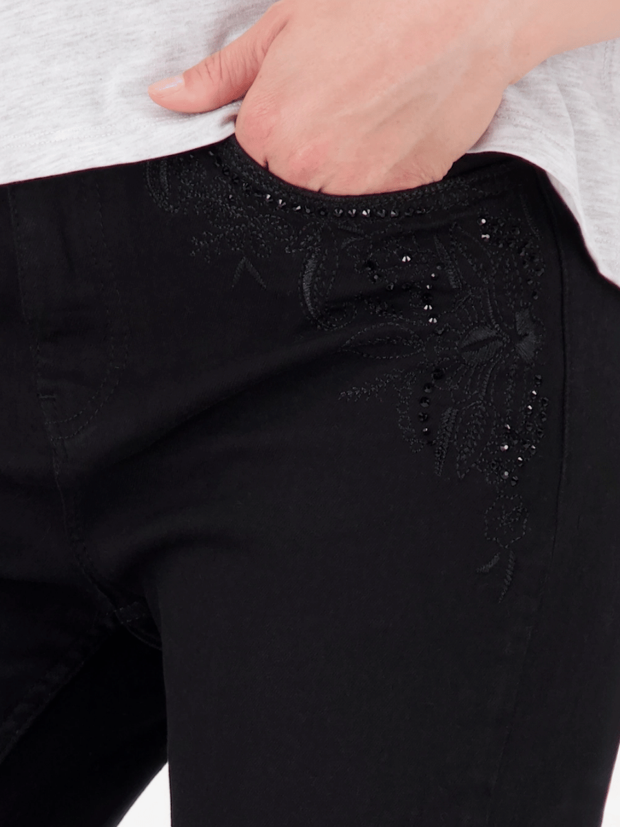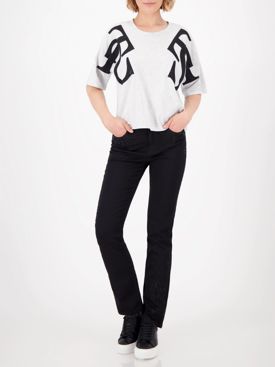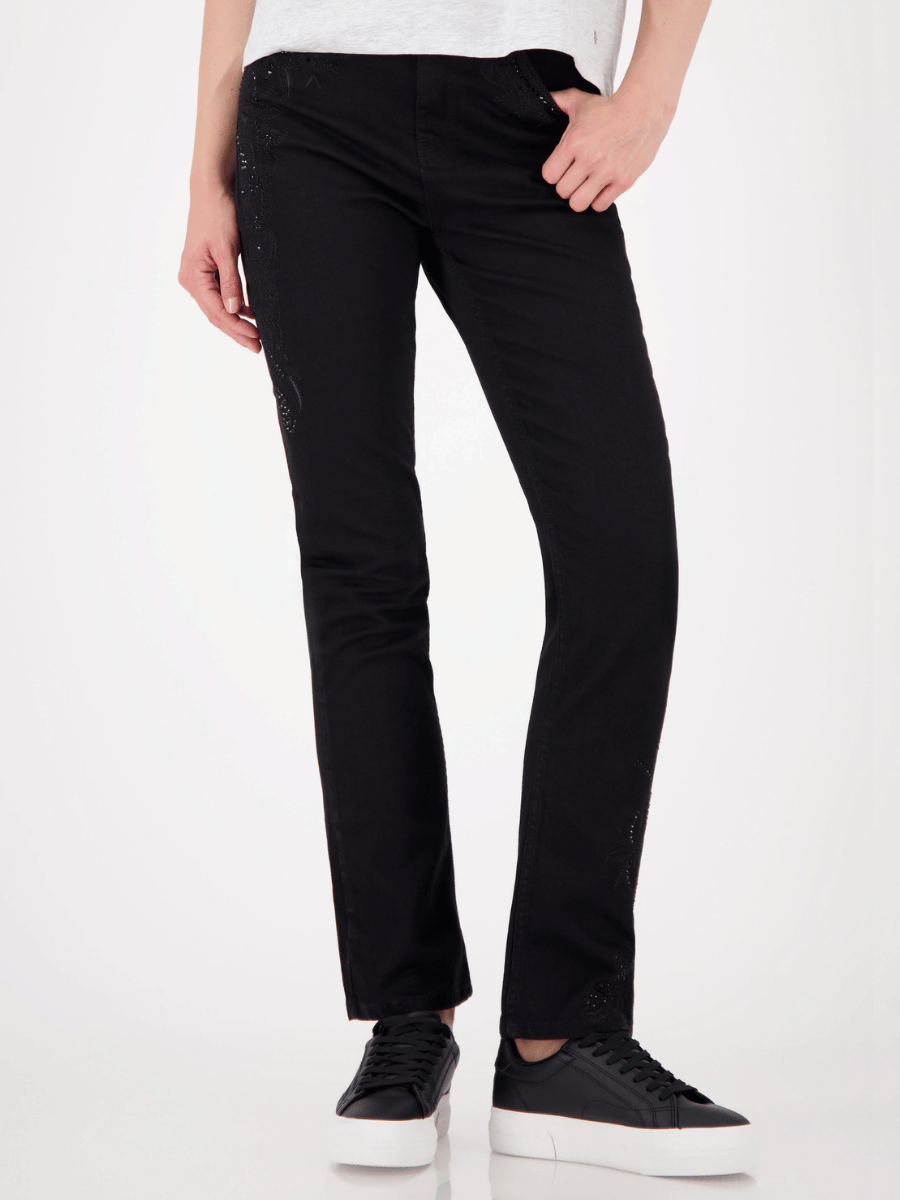 This full-length straight-fit Monari jean in black features tonal embroidery and subtle rhinestone detailing, finished with a structured waistband, five-pocket design, and a clean straight-leg silhouette. Designed for versatility, these Monari black straight-leg jeans combine everyday denim with decorative embellishment for a polished finish.