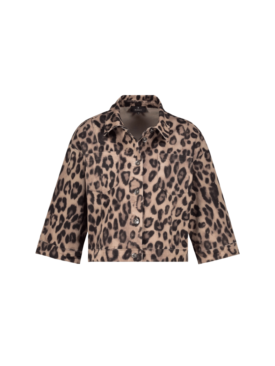 This three-quarter sleeve regular-fit Monari jacket features a cinnamon-toned leopard print with a structured shirt collar, button-through front, and a cropped hemline that sits neatly at the waist.