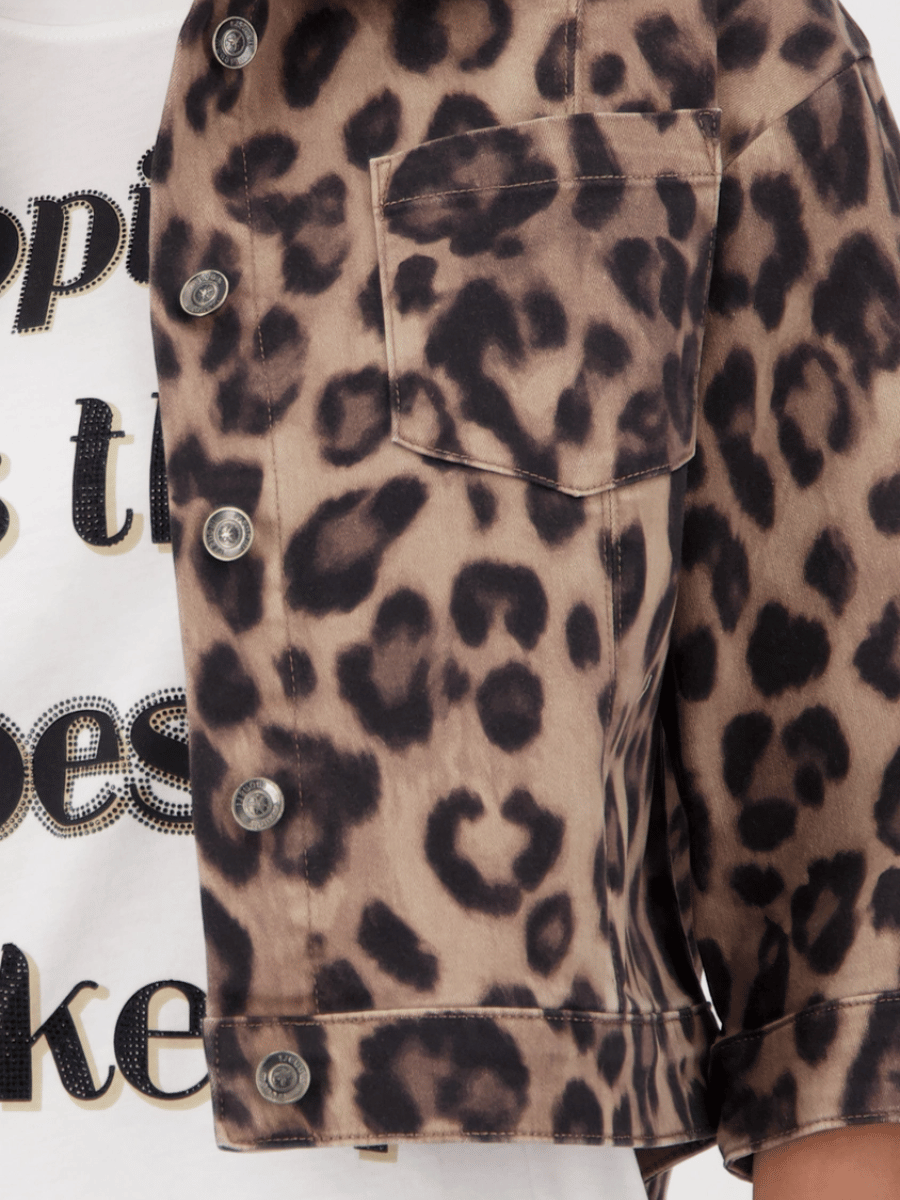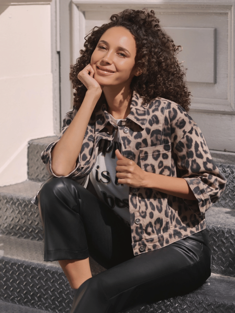 Style the Monari Leopard Print Cropped Jacket worn open or buttoned through over a simple tee or lightweight knit. Pair with high-waisted trousers, denim, or leather-look pants for everyday wear, or layer it as a light outer piece through transitional seasons.