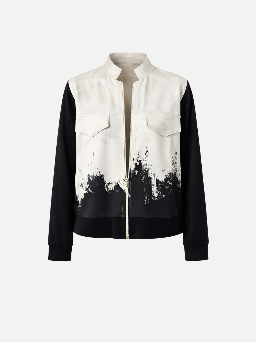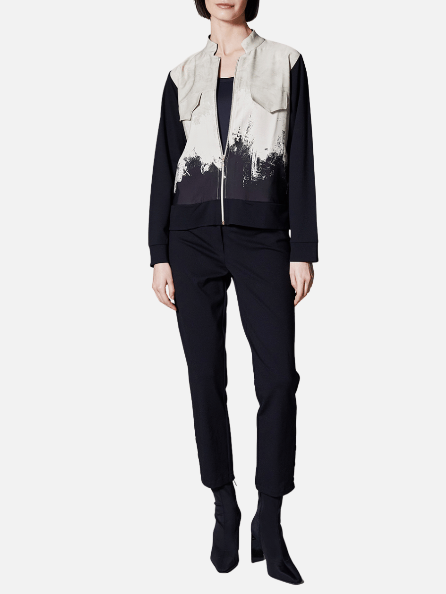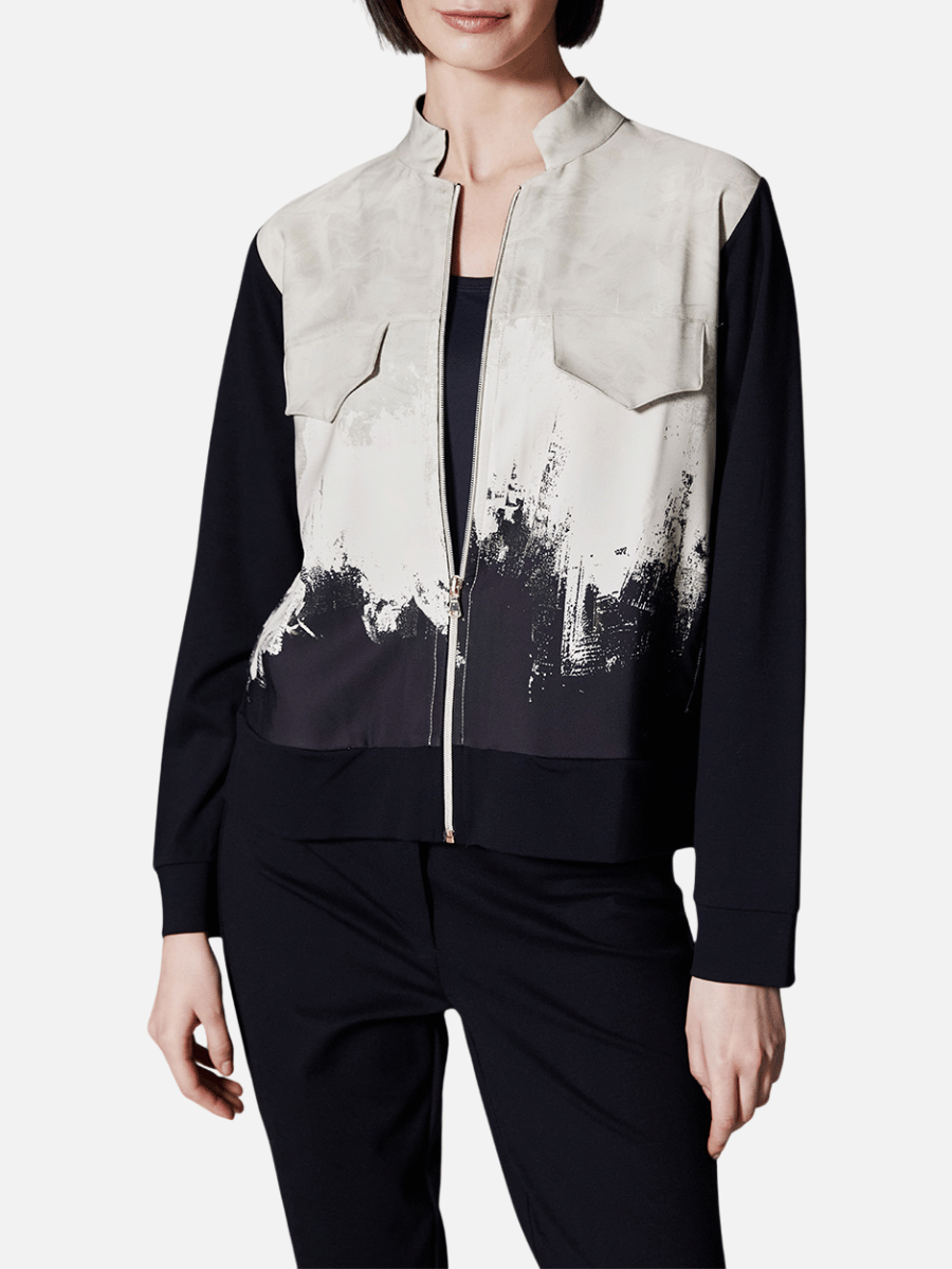 An artistic brushstroke print spans the front panel, creating a striking visual contrast against the neutral stone base. Finished with a clean stand collar, contrast sleeves, and practical front patch pockets, this Peruzzi jacket layers easily over tops, knitwear, or coordinating trousers for modern day-to-evening styling.