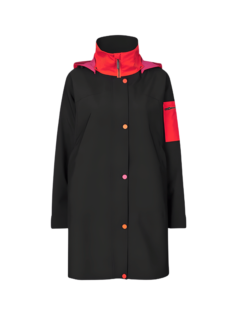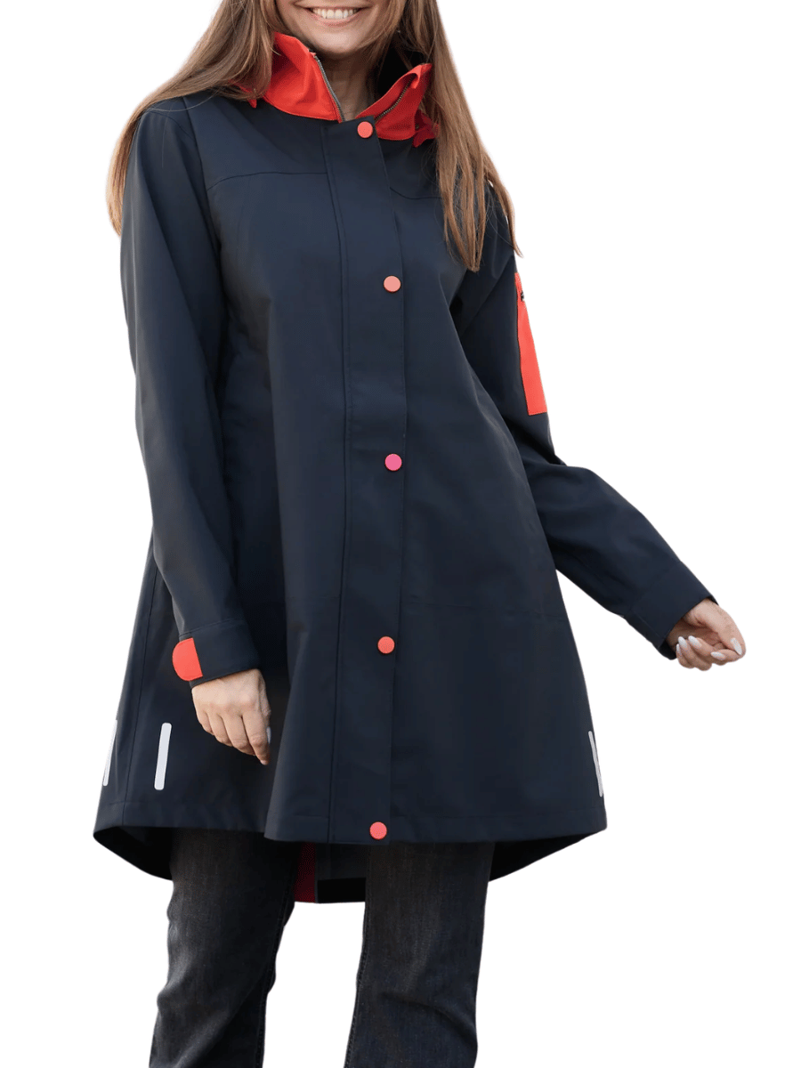 This black A-line raincoat features a concealed front zip with press-button placket, along with a detachable and adjustable hood for flexible weather protection. Designed for everyday wear, the Regn Jane raincoat layers easily over knitwear and denim, making it suitable for commuting, travel, and wet-weather walking.