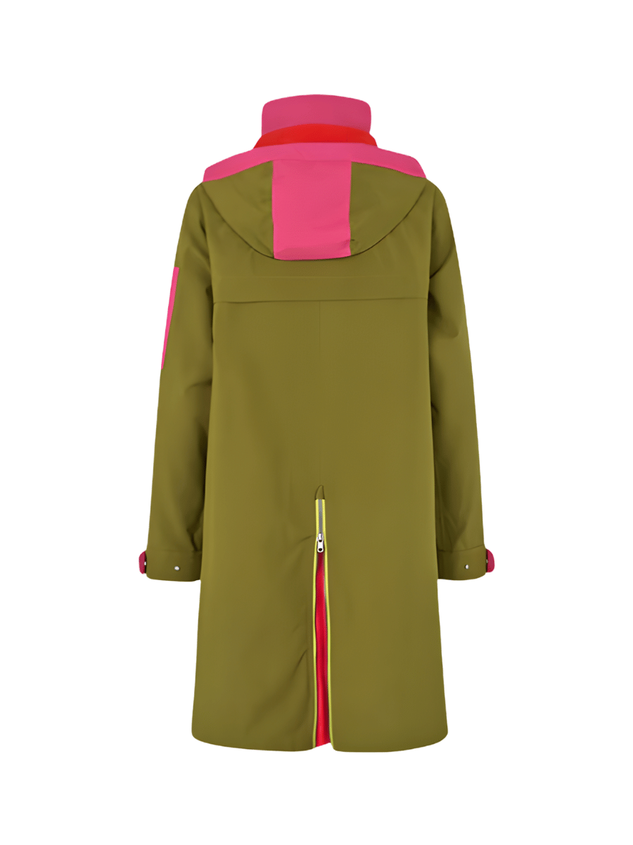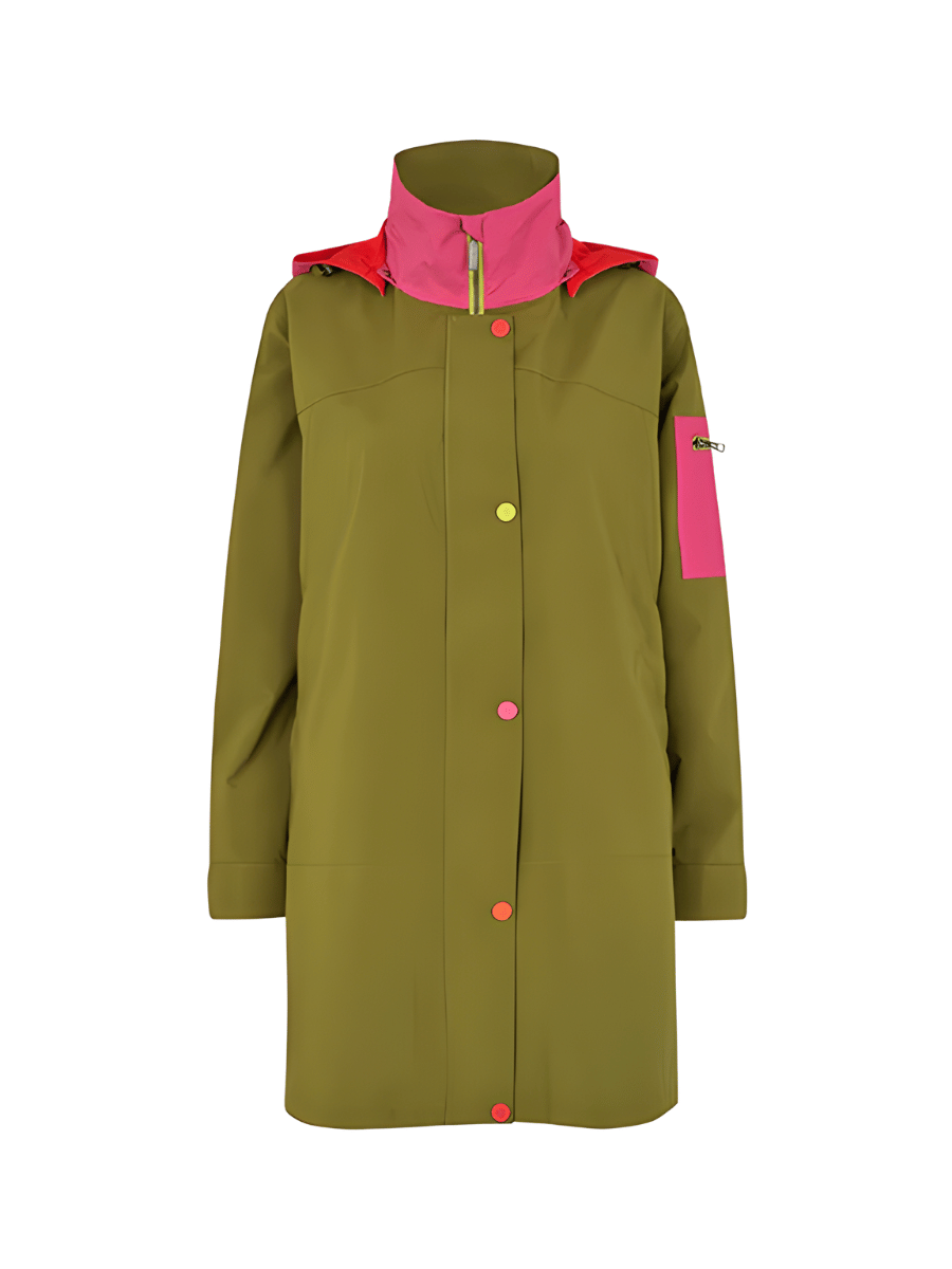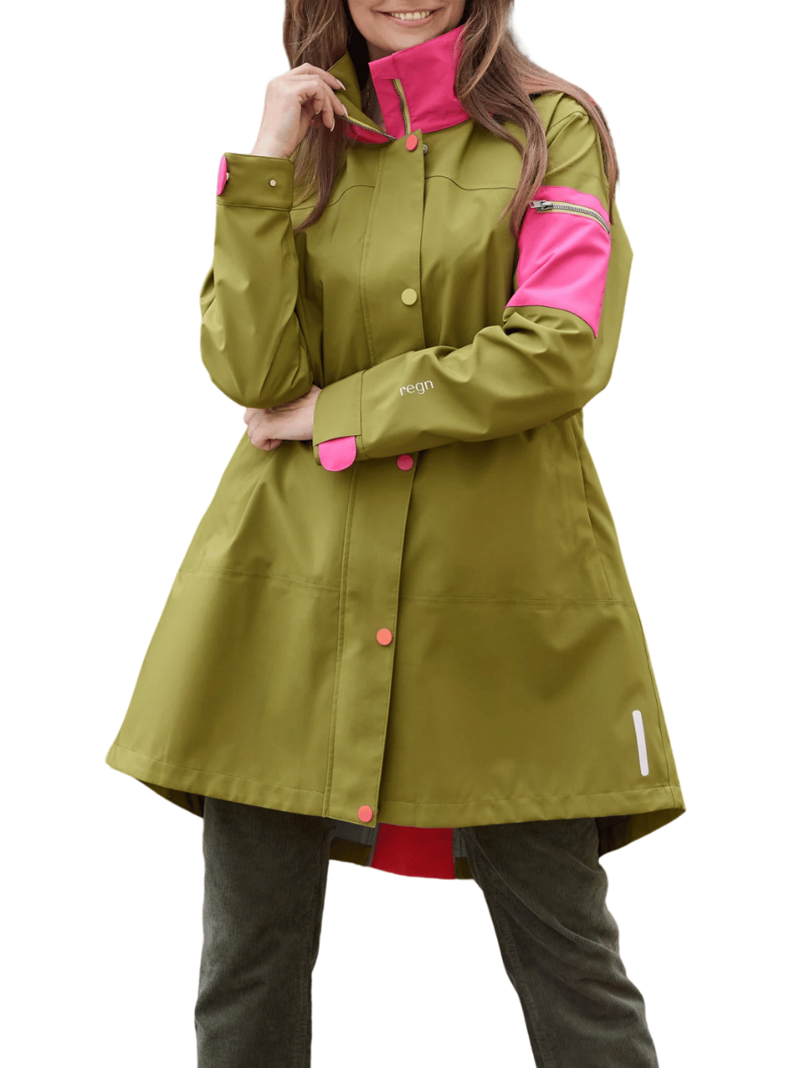 The Regn Jane Waterproof A-Line Raincoat in Olive Green features: