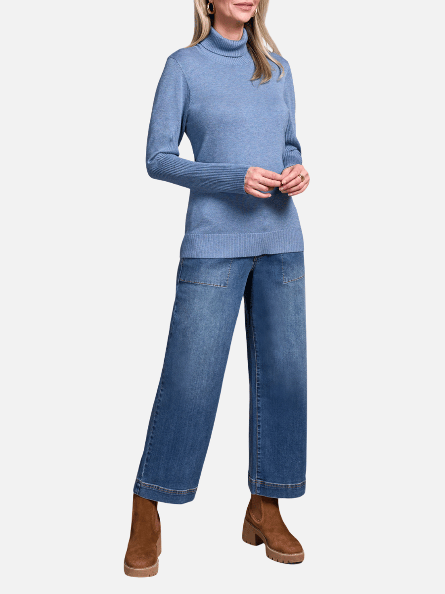This long-sleeve, relaxed fit Tribal Fashion Canada knit sweater in dusty slate blue is finished with a classic turtleneck neckline and a clean straight hem for a refined, easy-to-wear silhouette.