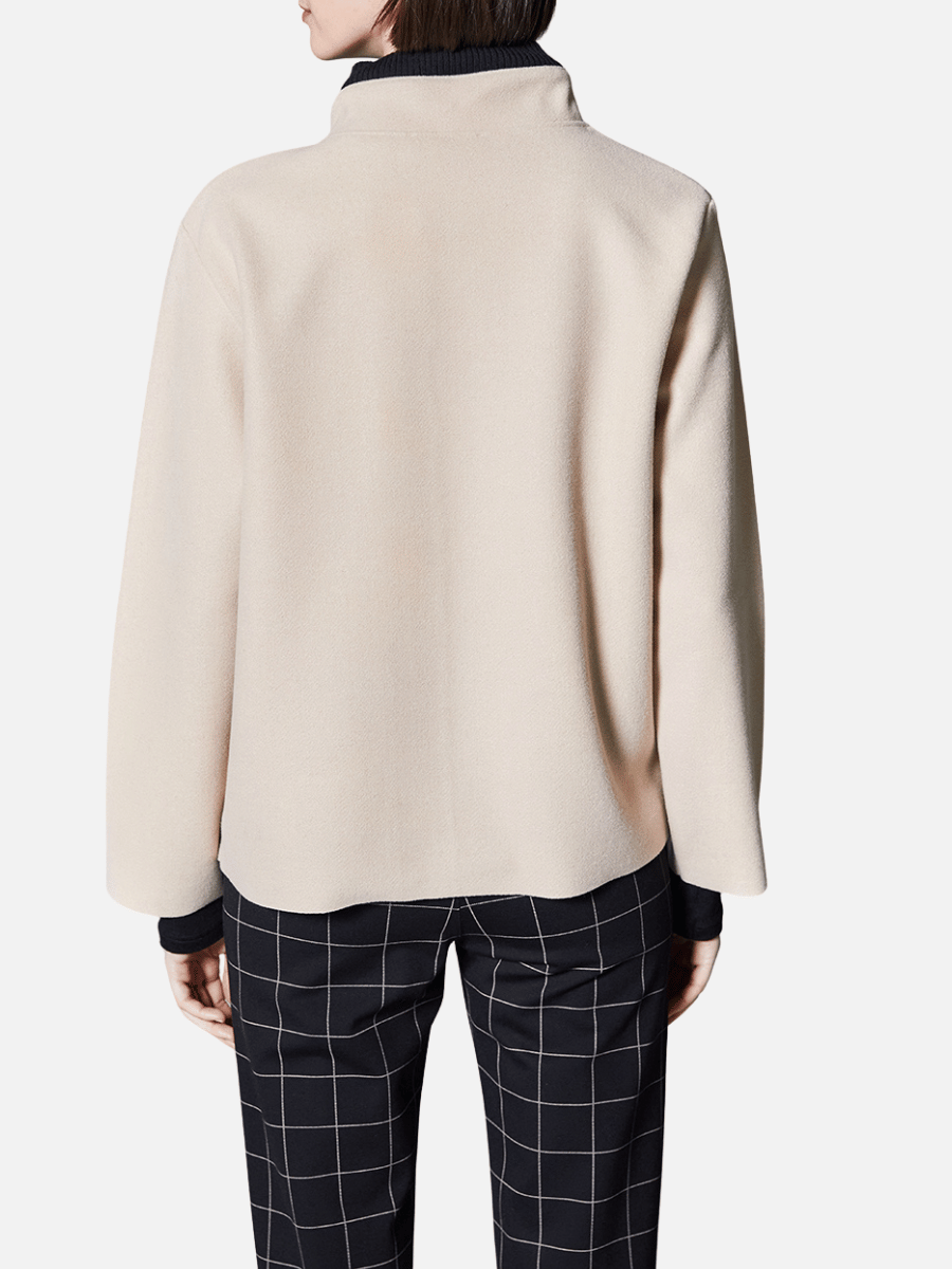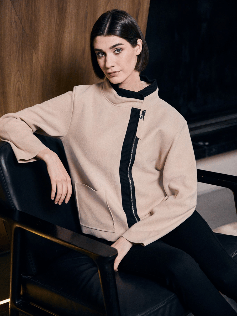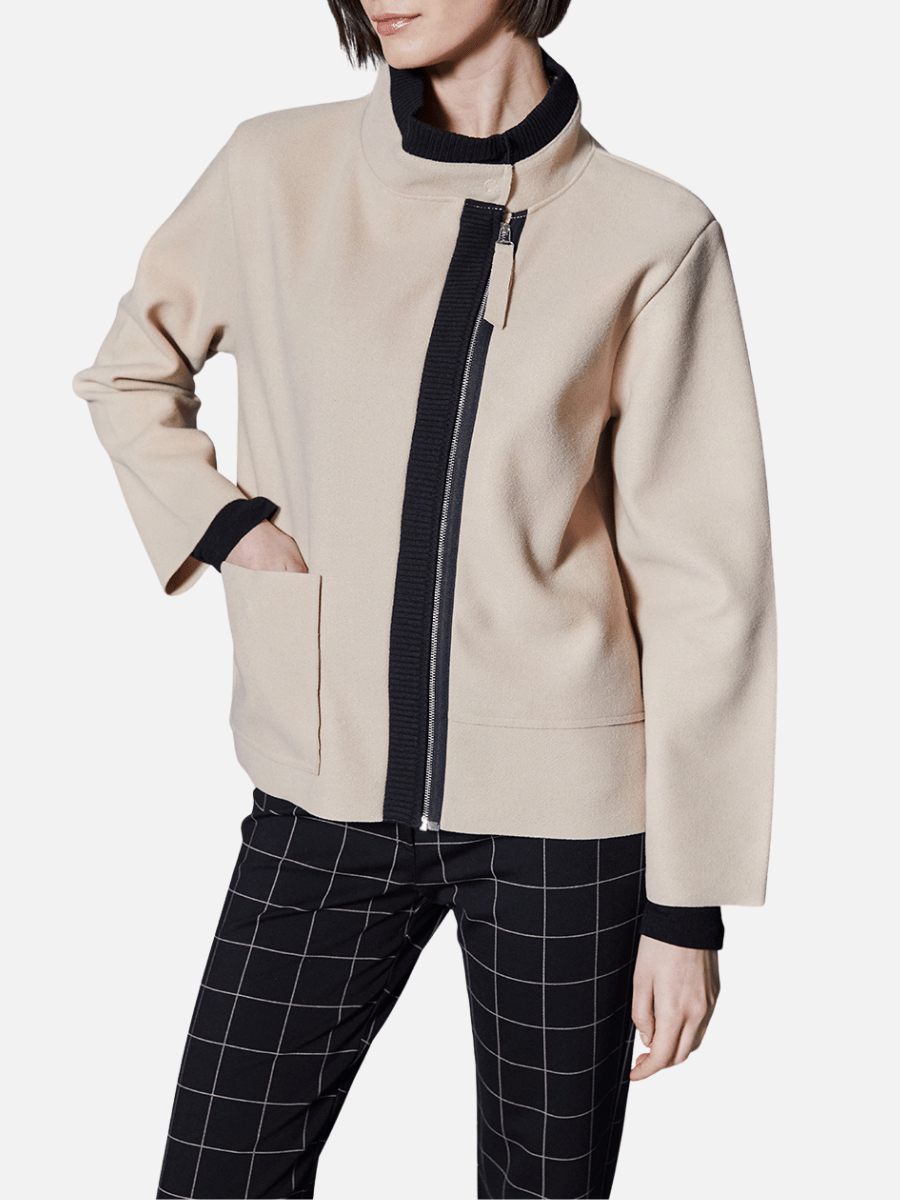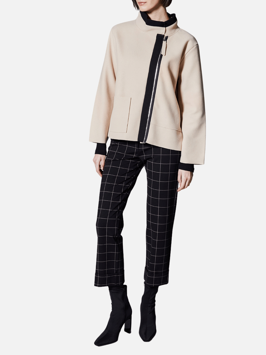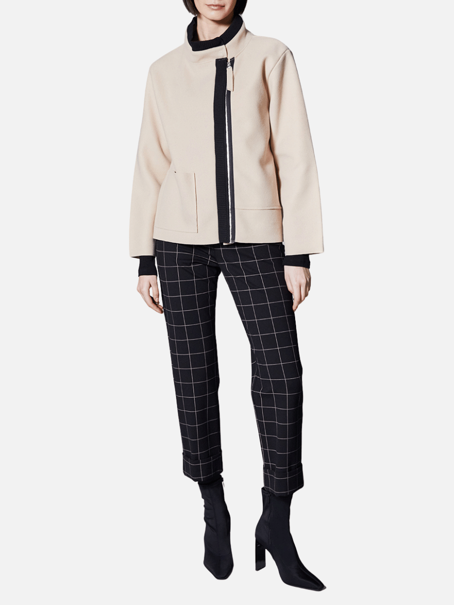 Perfect for layering over knitwear or long-sleeve tops, this Peruzzi jacket works seamlessly with both tailored and casual pieces. The contrast trim detailing and asymmetrical zip closure introduce a contemporary edge, while the relaxed fit ensures ease of movement. Style it with the Peruzzi Window Pane Check Cropped Trousers in Black 126 for a polished, coordinated outfit.