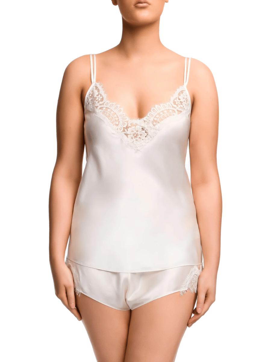 This sleeveless slim-fit Sainted Sisters camisole features a creamy ivory silk finish with a lace-trimmed V-neckline and double spaghetti straps. The fluid silhouette and scalloped lace detailing create a refined, feminine shape. Cut from pure silk, the Selina Cami drapes softly through the body while maintaining a clean, lightweight profile.