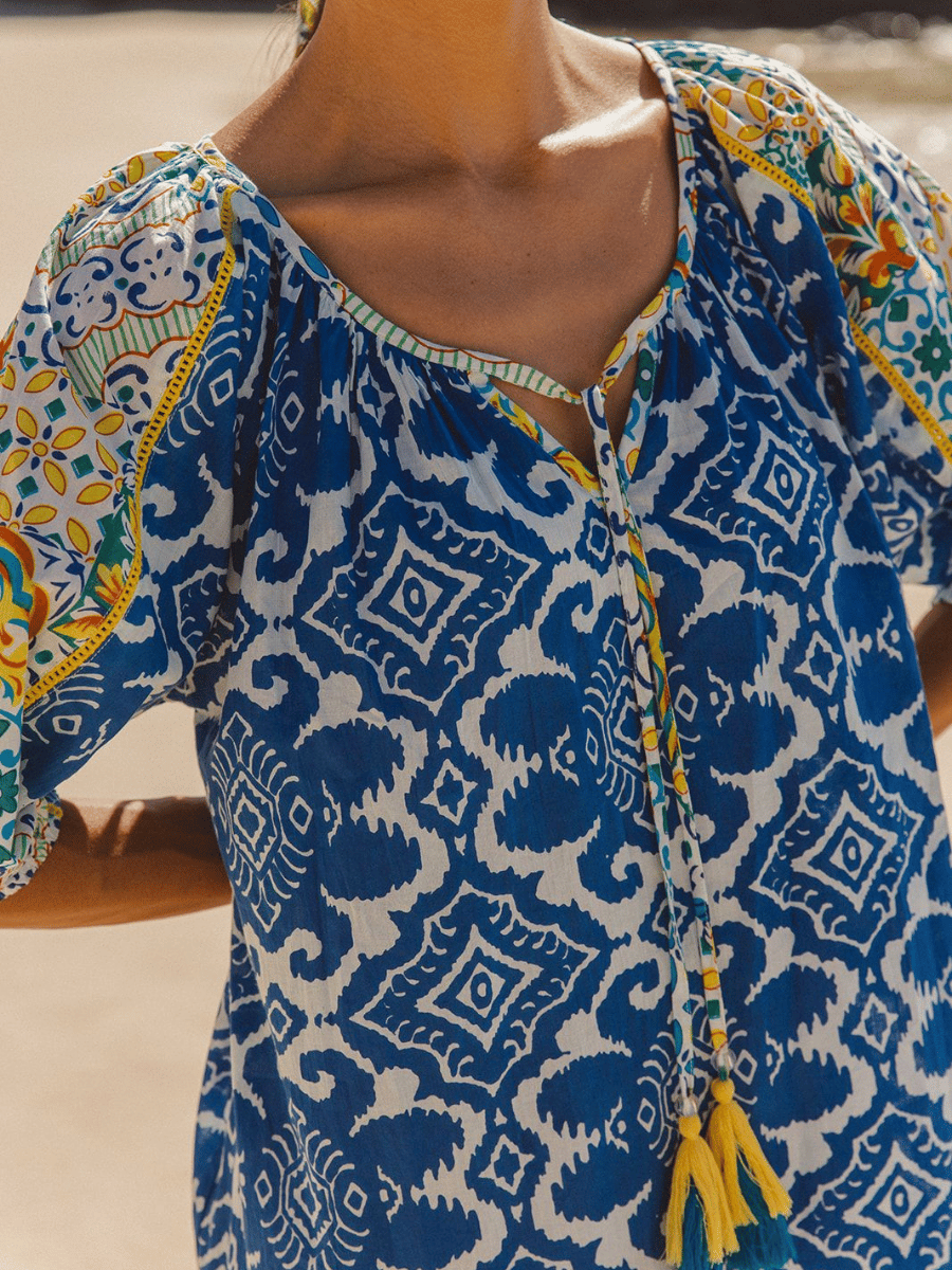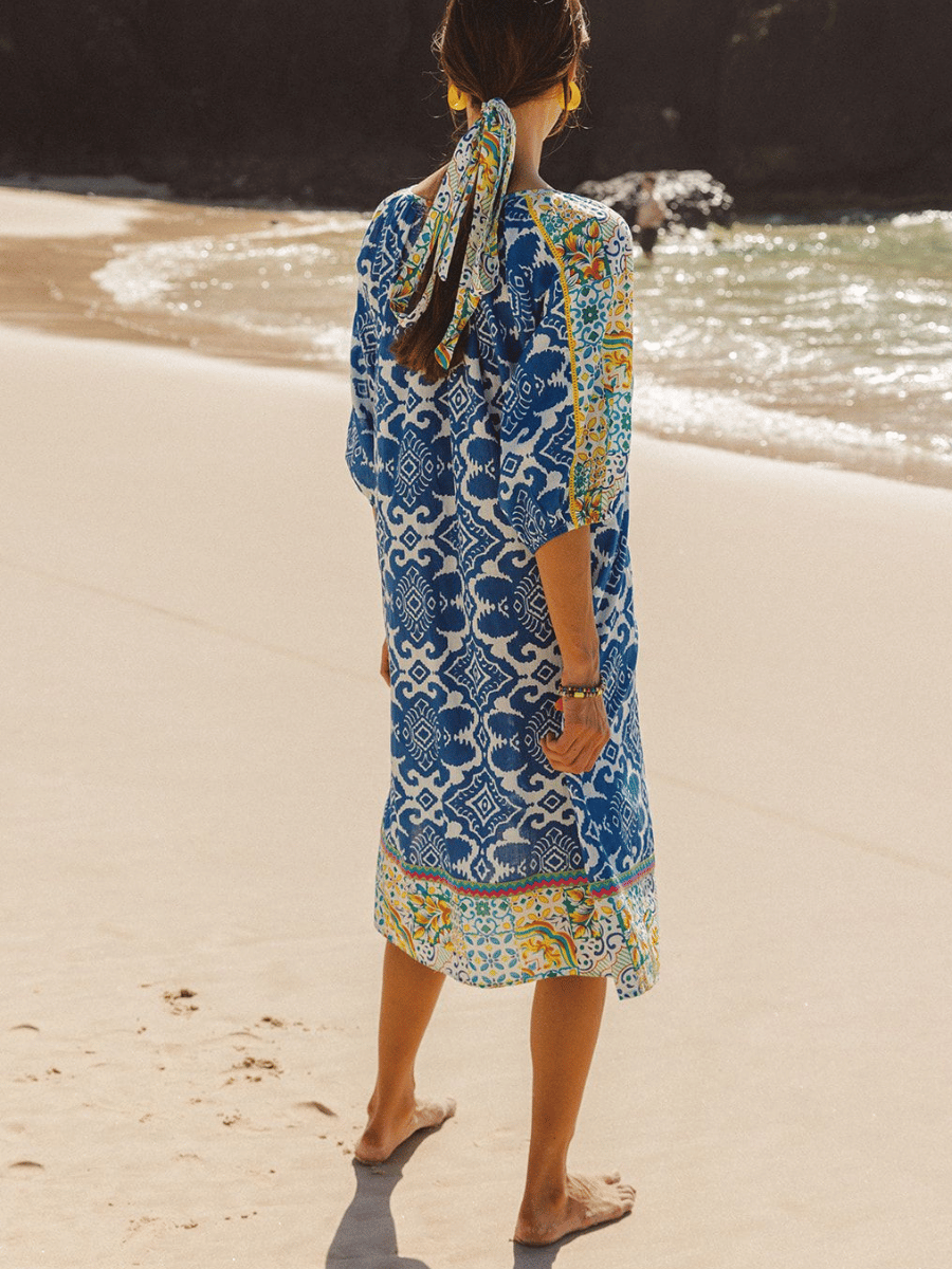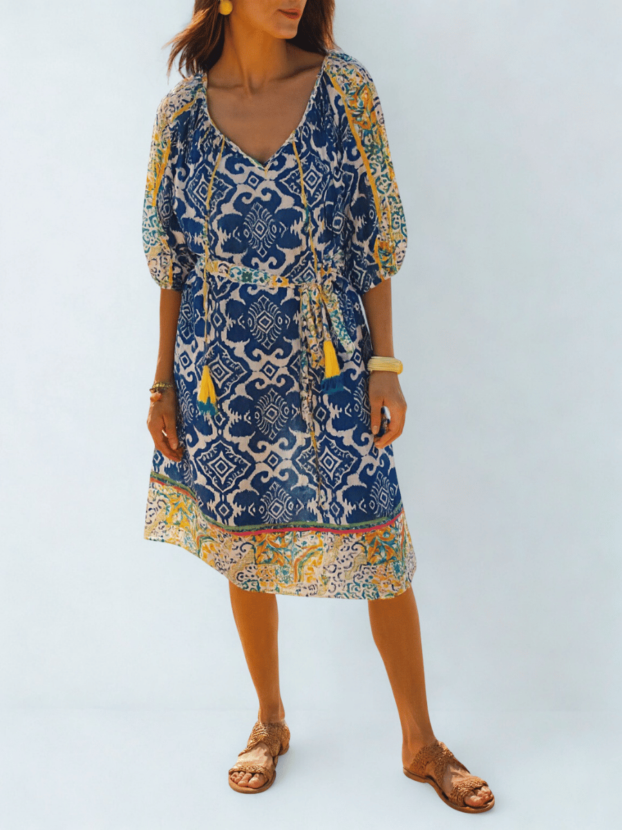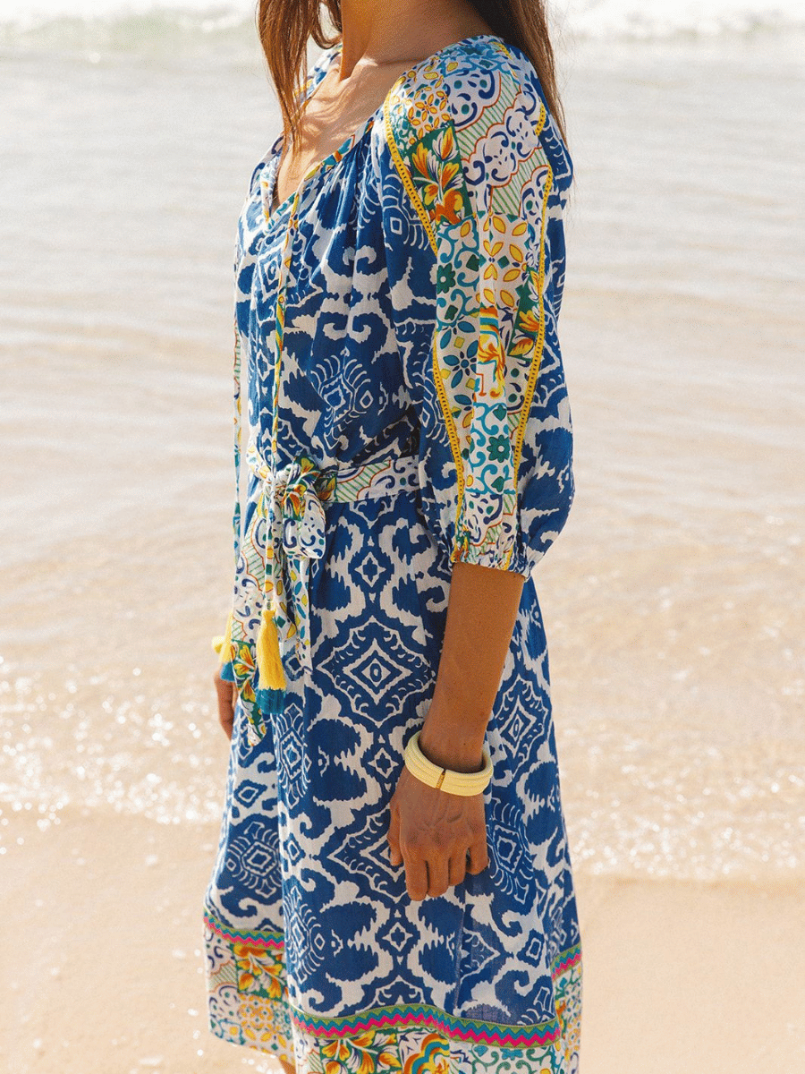This three-quarter sleeve relaxed fit I Am Pylgrym midi dress features a blue, white and yellow Italian summer print, finished with a flattering V-neckline with tassel ties, a softly cinched waist, and contrast border detailing for a refined bohemian silhouette.