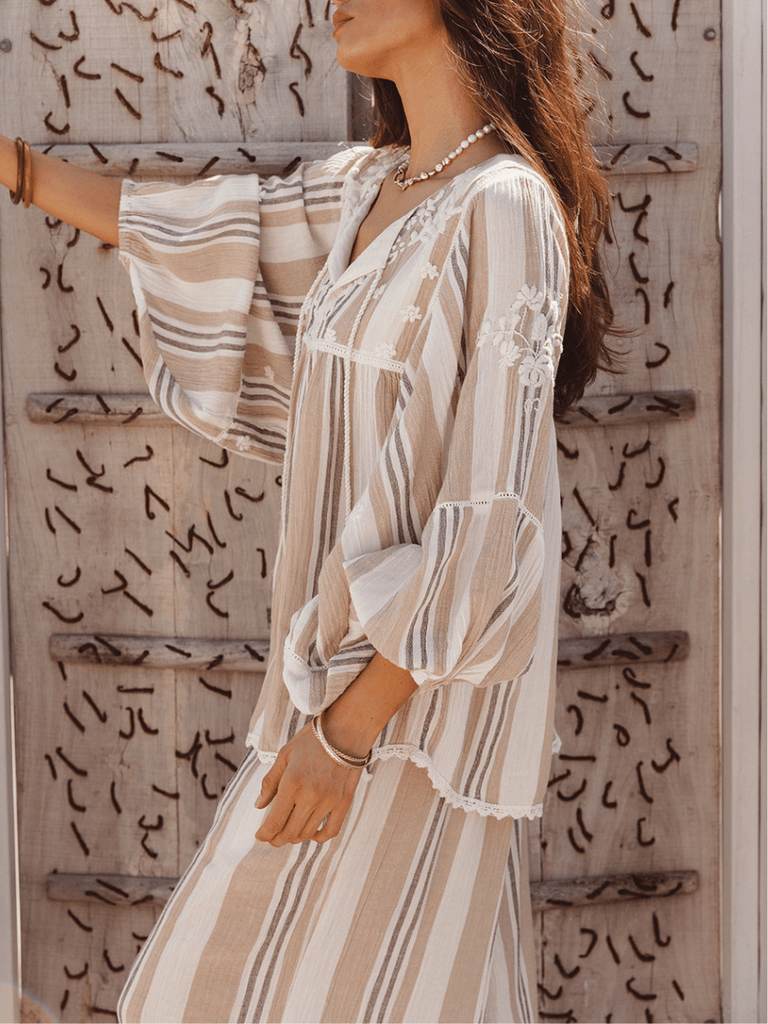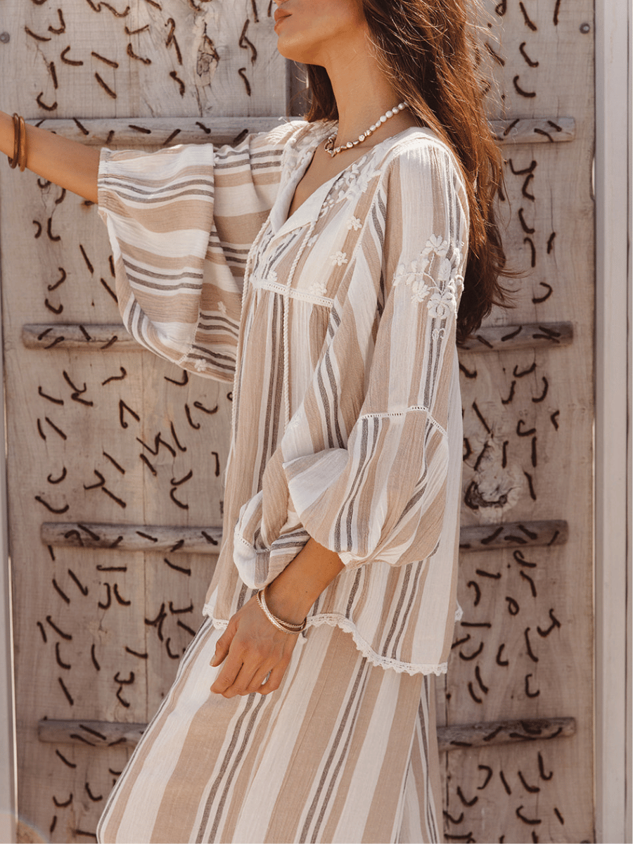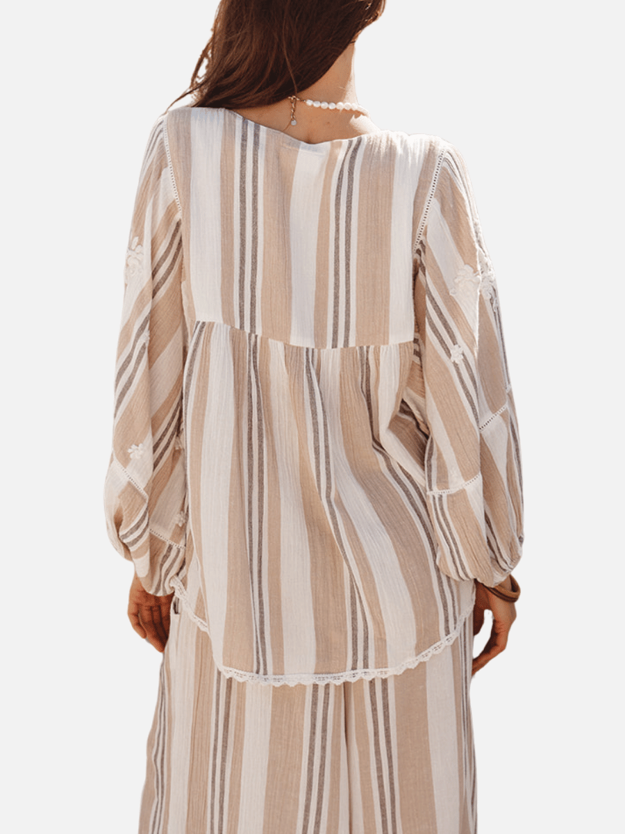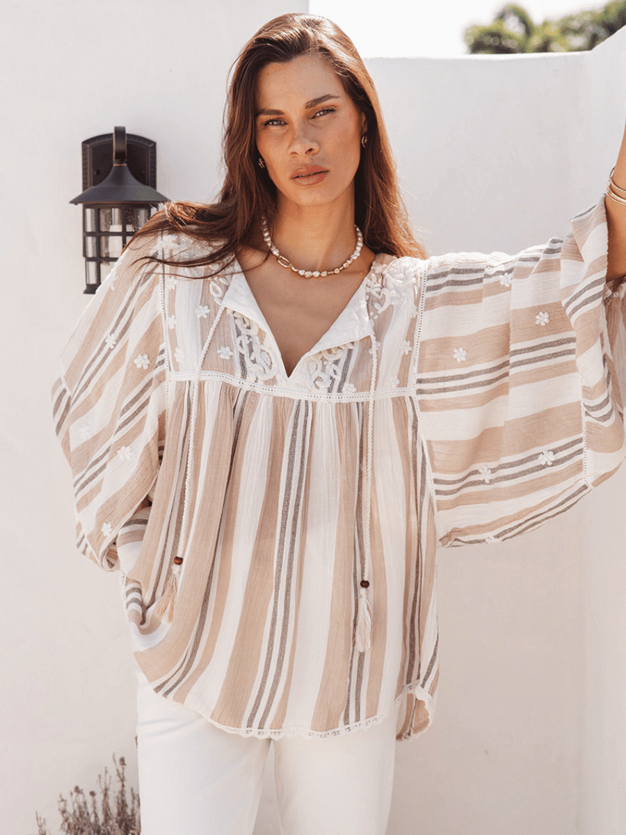 This long-sleeve relaxed fit I Am Pylgrym blouse features beige and white stripes with delicate embroidered detailing, finished with a soft V-split neckline, tassel ties, and gently gathered balloon sleeves for a breezy, bohemian silhouette. Scalloped lace edging and subtle gathering add artisanal texture, giving the Byron Top an effortlessly feminine drape.