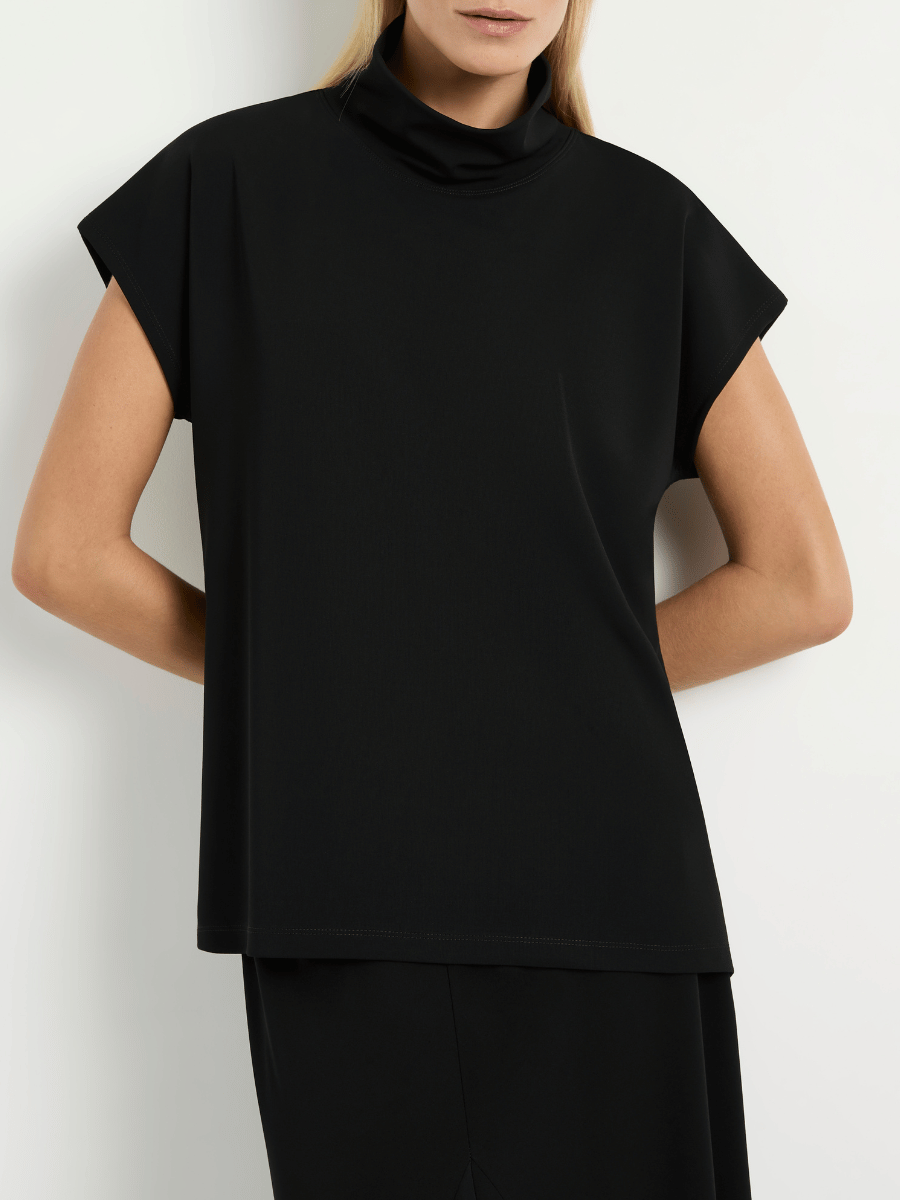 This funnel neck, short sleeve top is crafted in a relaxed fit from stretch powder knit fabric. Designed with a short extended sleeve, the Mela Purdie Funnel Shell has a clean and classy silhouette and can be worn simply paired with jeans or layered in colder months.