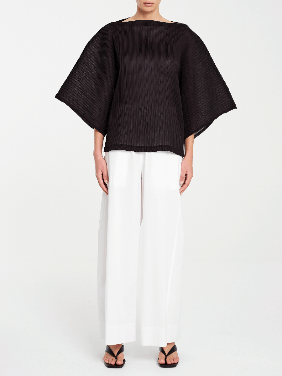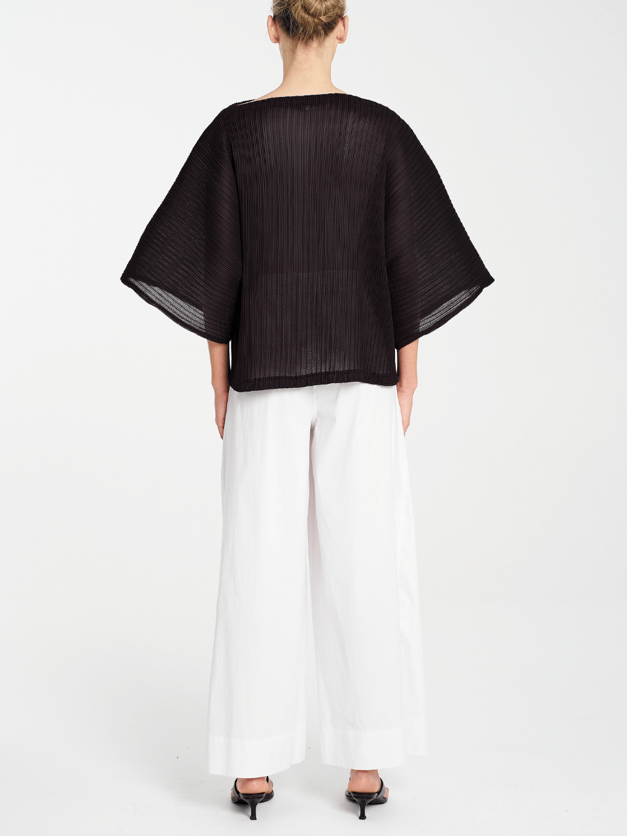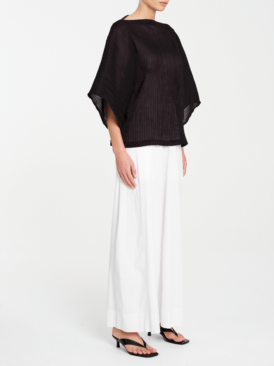 This relaxed fit Mela Purdie top features a refined pleated texture and is designed with a softly structured boat neckline and exaggerated batwing sleeves, offering a sculptural yet lightweight silhouette.