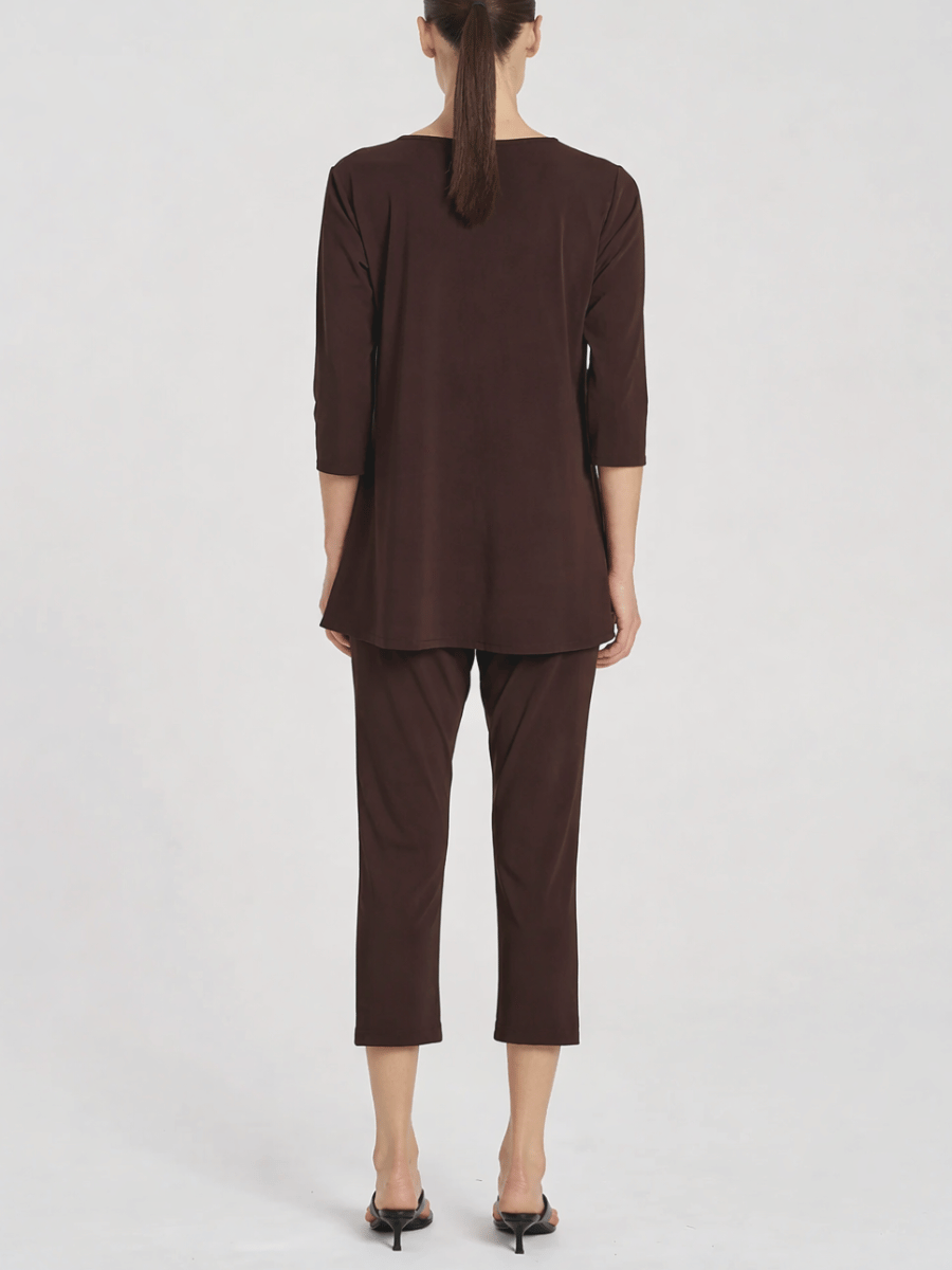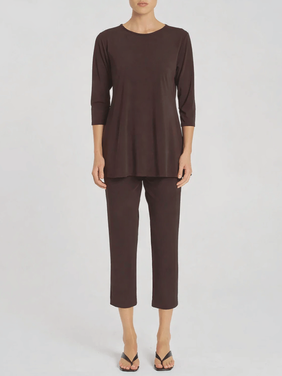 This 3/4 sleeve fit and flare Mela Purdie top features a boat neckline and a flattering A-line silhouette in a dark chocolate brown finish. Crafted from Mela's Powder Knit fabrication, the Mela Purdie Flared Top offers a soft matte texture with stretch for ease and comfort.