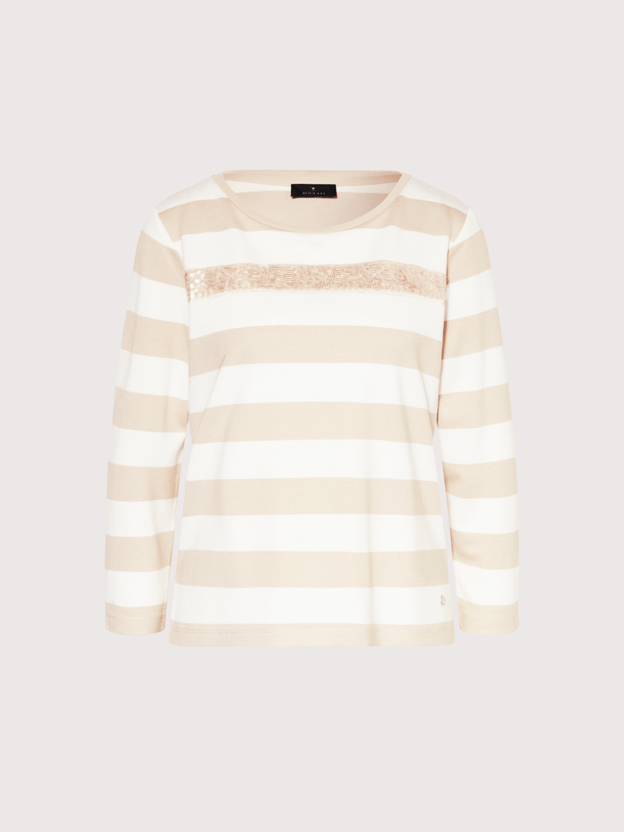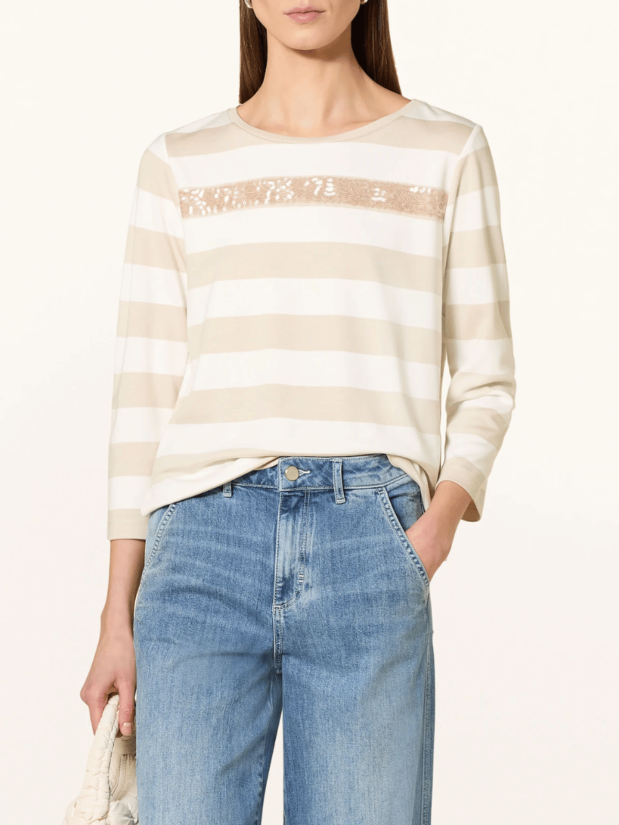 This hip-length Monari sweatshirt features a regular fit with 3/4 length sleeves, a classic round neckline, and a bold striped pattern in cream and beige. Sparkling sequins are integrated into the stripes, adding a touch of shimmer to the casual silhouette. Side slits offer added movement and comfort, while a subtle logo plate provides a signature finish.