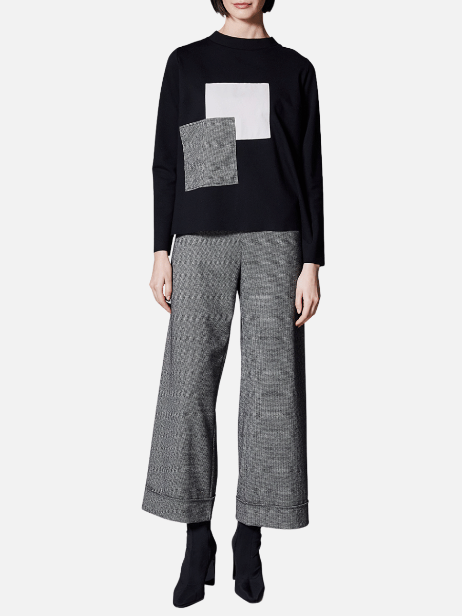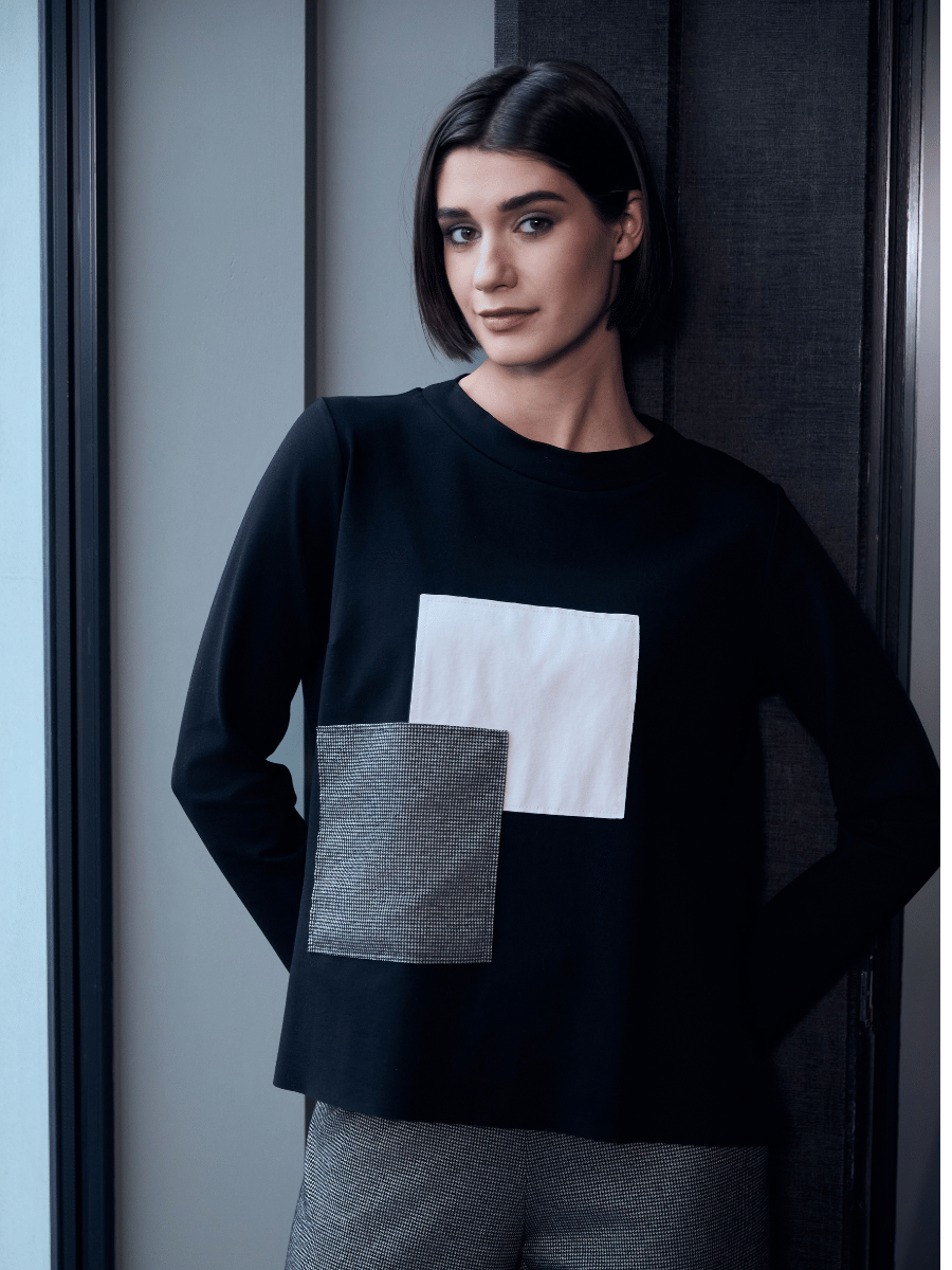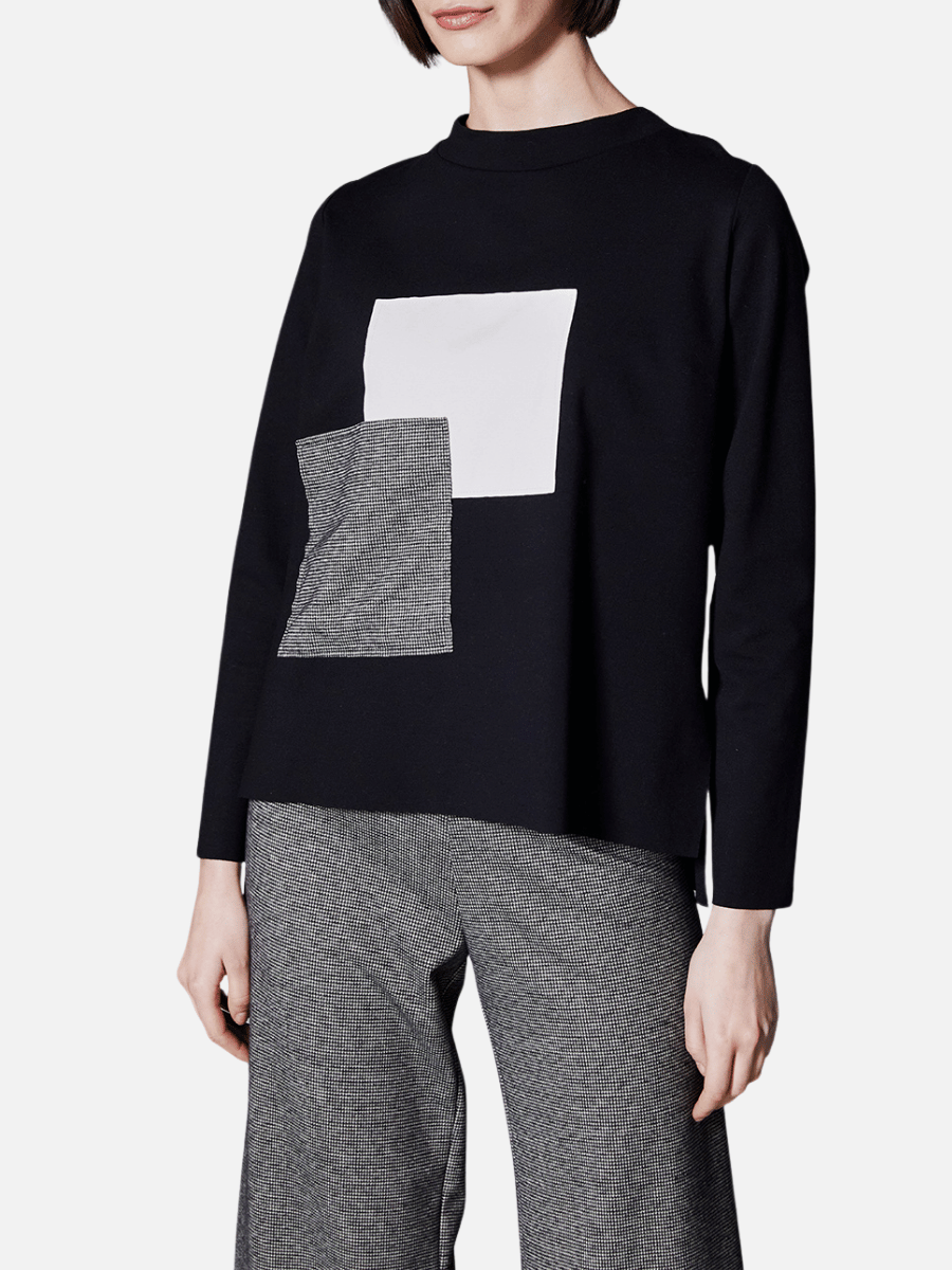 The Peruzzi Appliqué Pocket Detail Stretch Top in Black and Ecru features a long sleeve relaxed silhouette with a modern round neckline and statement appliqué square panel detailing, creating a contemporary women’s top with graphic contrast and texture. Designed in a classic black base with ecru and houndstooth accents, this Peruzzi top delivers a polished yet directional look.