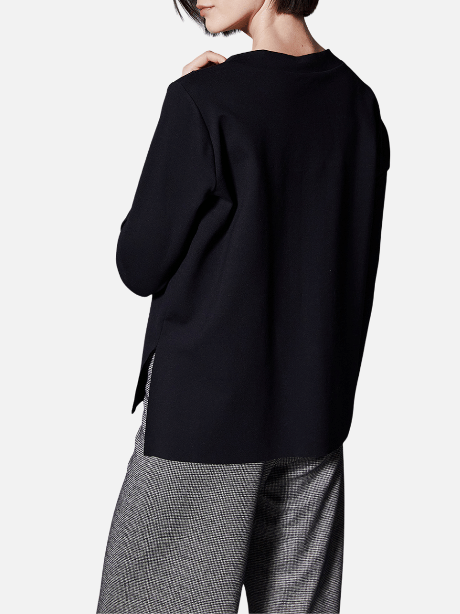 Crafted from a soft stretch jersey, this women’s black long sleeve sweater offers comfort while maintaining structure. The layered appliqué pocket-style panels introduce visual depth, combining smooth and textured finishes for a refined, modern aesthetic. Side hem splits enhance movement and ease of wear. Style with the Peruzzi Houndstooth Turn Up Trouser for a coordinated outfit, or pair with tailored black trousers or denim for versatile day-to-evening dressing.
