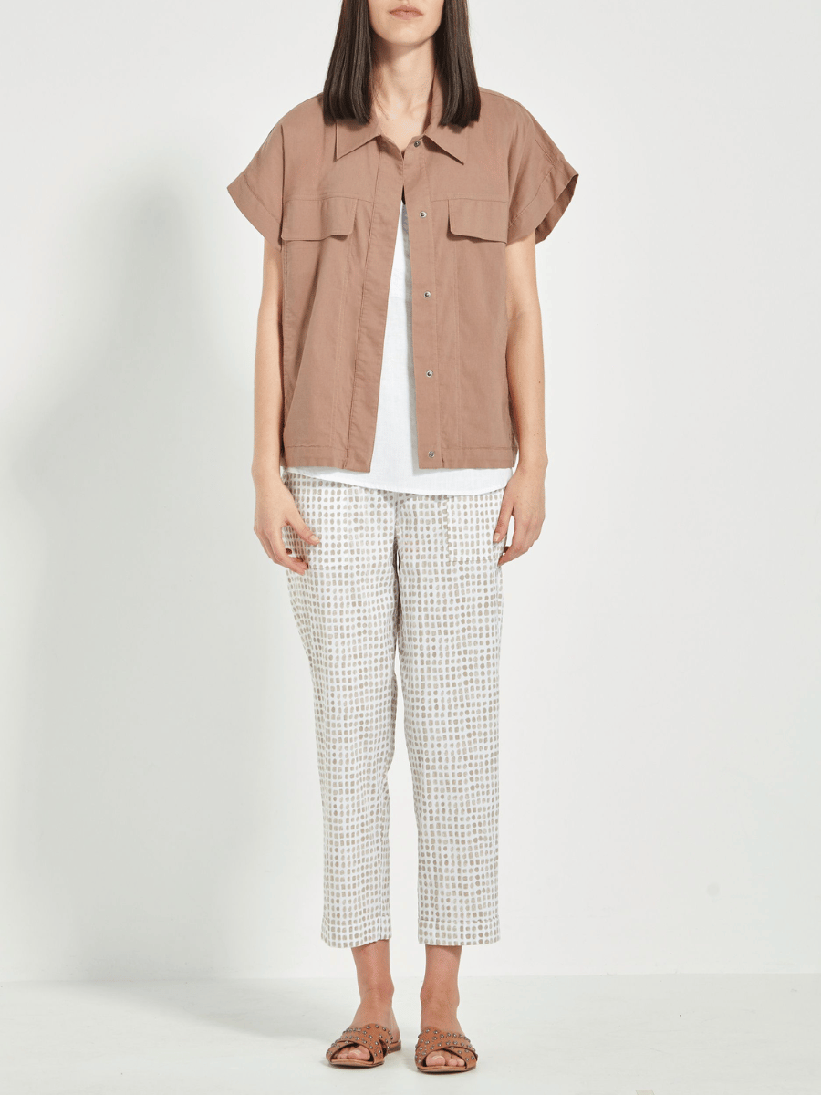 Perfect for summer travel or weekend outings, this Verge pant pairs beautifully with a linen shirt, lightweight knit, or cotton tee. Its neutral beige-toned geometric print complements both soft neutrals and rich earthy hues, ensuring easy coordination across your wardrobe for an effortlessly polished look.