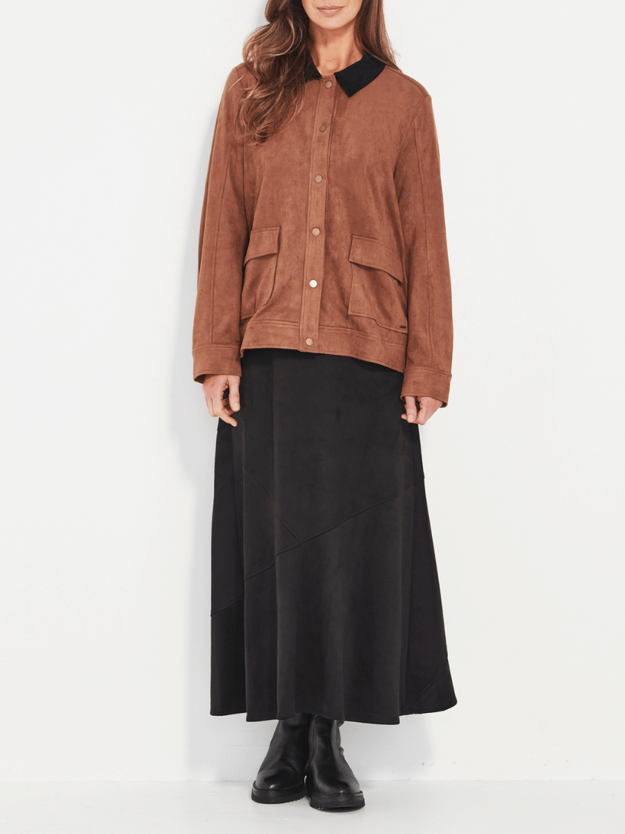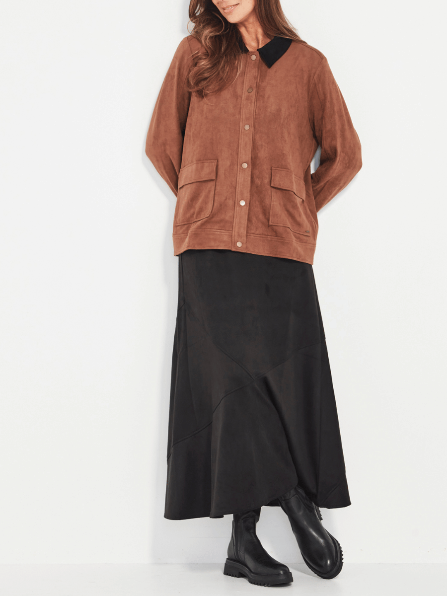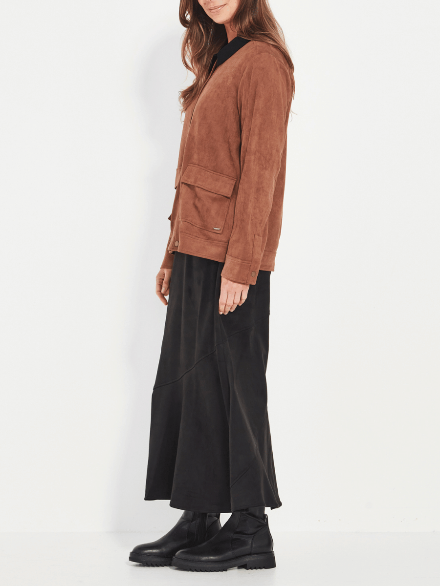The Alina Skirt is crafted from supple faux suede, offering a soft hand feel with a refined, elevated finish. Designed on the bias, it skims the body with beautiful fluidity, creating a flattering, feminine silhouette with effortless movement.