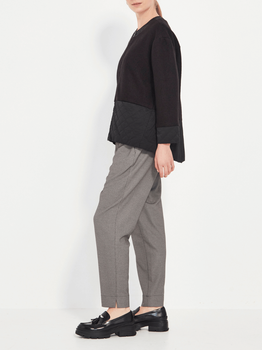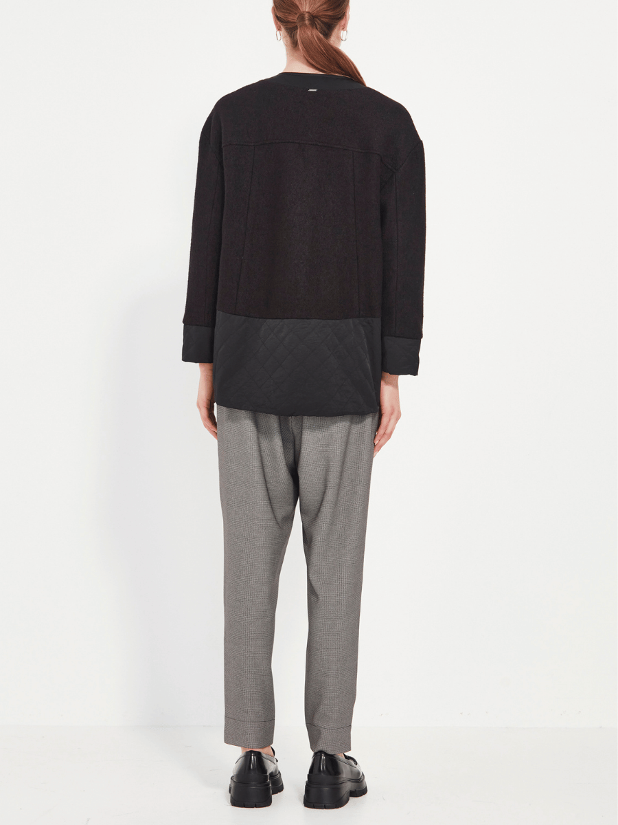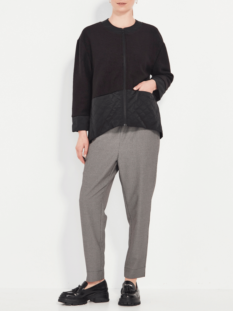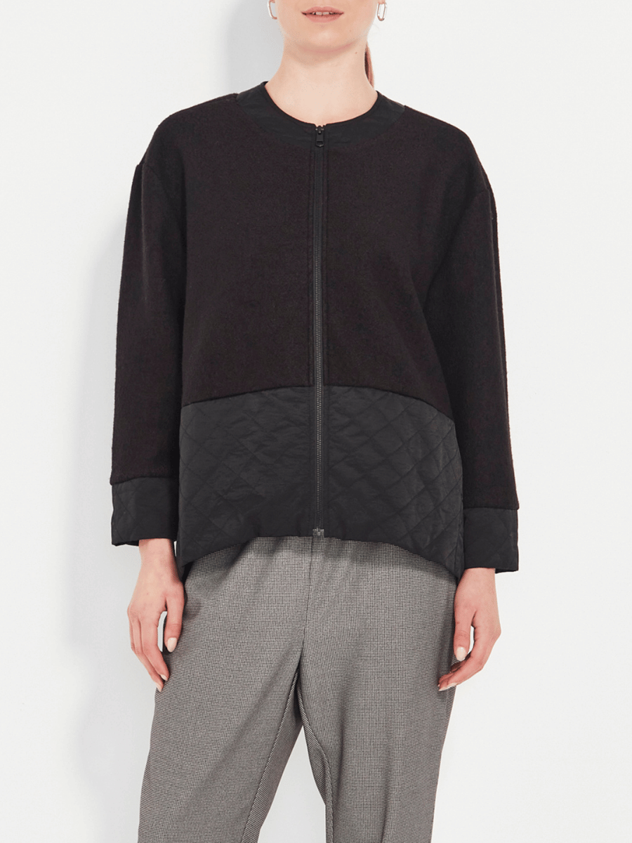 The Faye Jacket blends modern texture with everyday ease. Designed with a clean crew neckline and a sleek front zip, it offers a refined, streamlined silhouette. The neckline and patch pockets are crafted in a contrast quilted fabric, adding depth, softness, and a subtle utility-inspired edge.