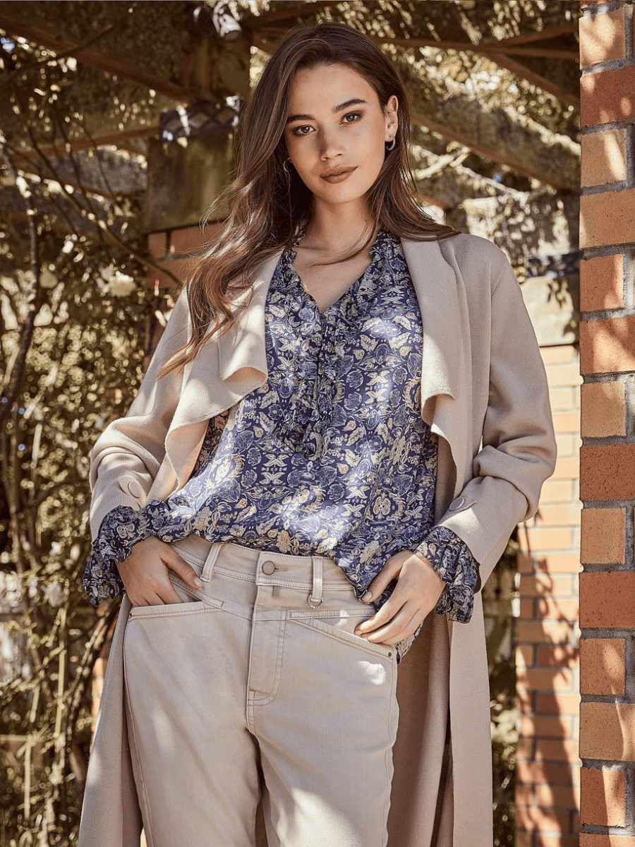 The Mercy Blouse is crafted from a soft drape fabric that moves gently with the body, offering an effortless, elegant feel. The ruffle neckline brings a touch of softness, while delicate gathering at the shoulder adds subtle volume and a feminine shape.